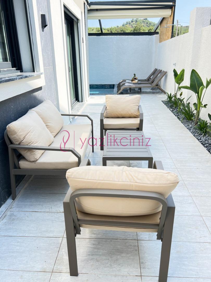 Bahçe oturma grubu, şezlong, yemek masası, semsiye mevcuttur.