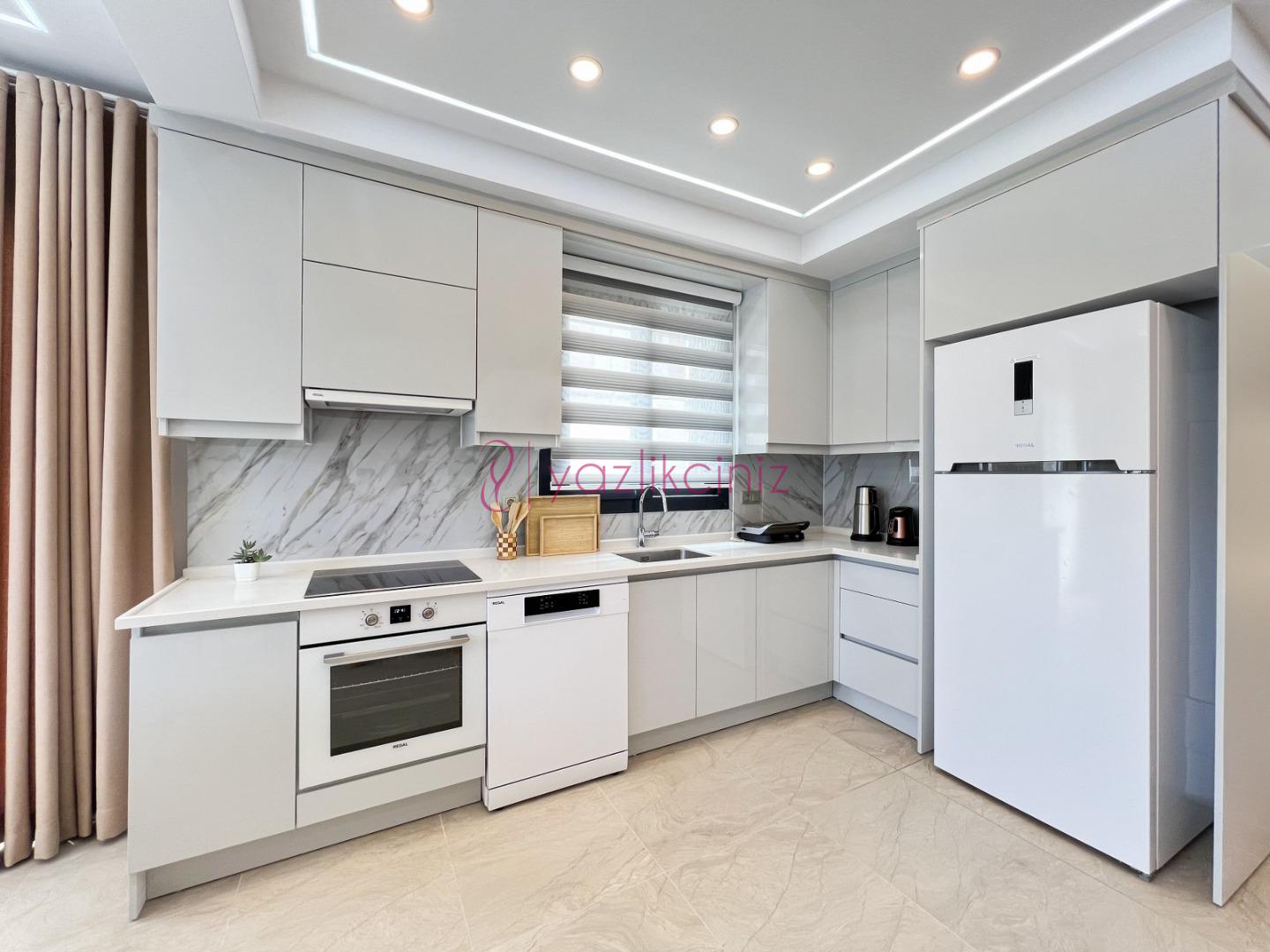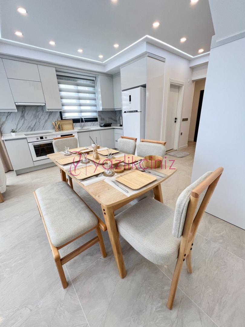 Buzdolabı, çamaşır makinesi, bulaşık makinesi fırın, 4 lü ocak, su ısıtıcısı(kettle), tost makinesi, yemek masası ve 4 kişi için mutfak takımı bulunmaktadır.
