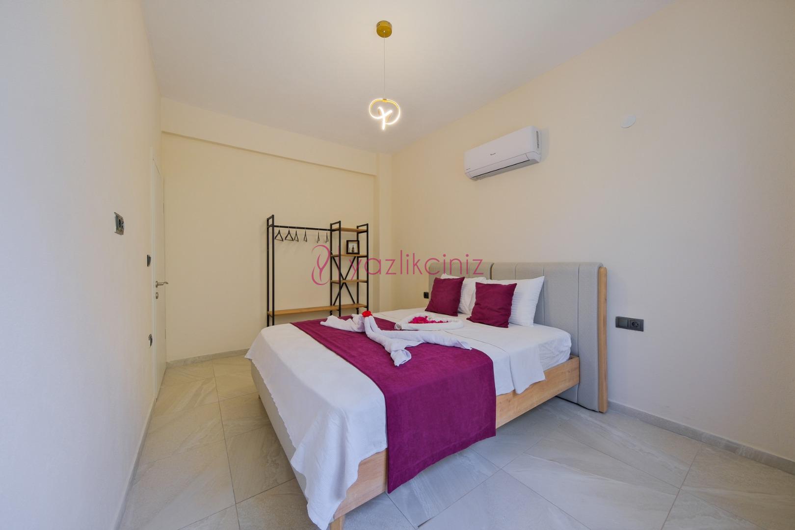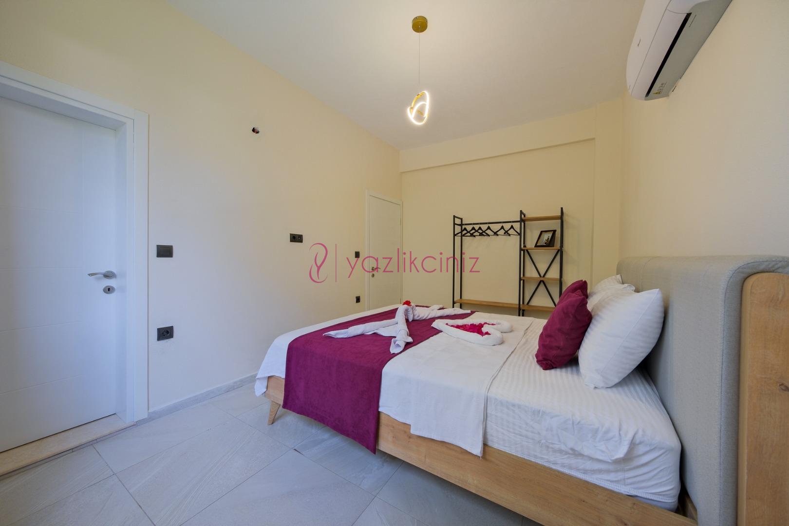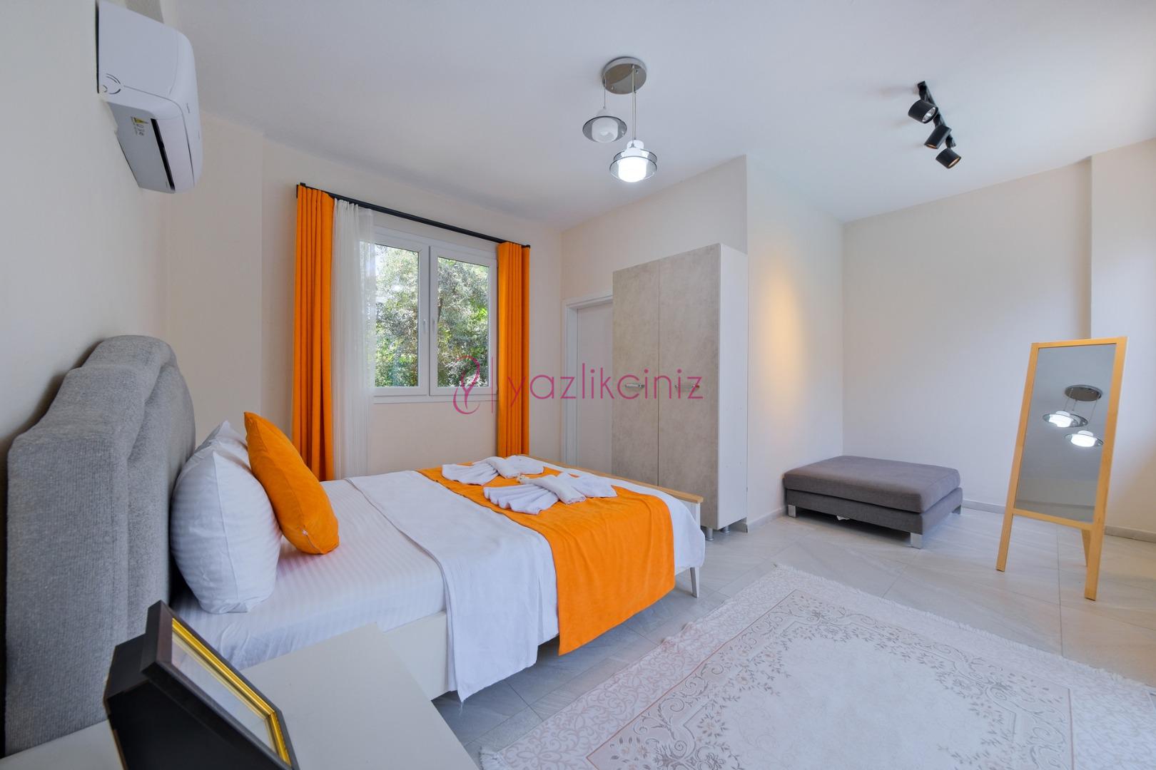 Yatak odası 1: Çift kişilik yatak, klima, komodin, elbise dolabı , makyaj masası, sauna banyo ve tuvalet bulunmaktadır.