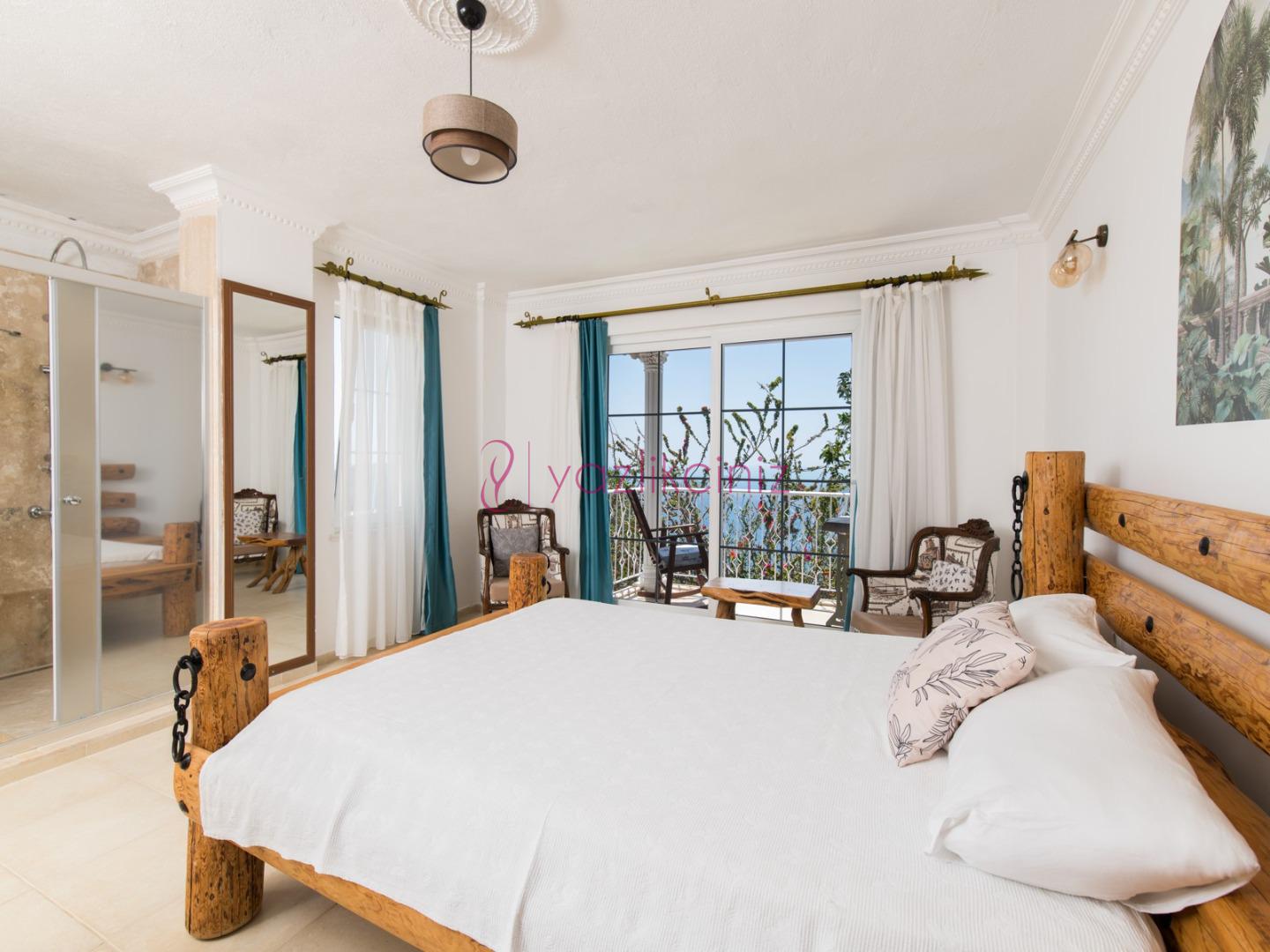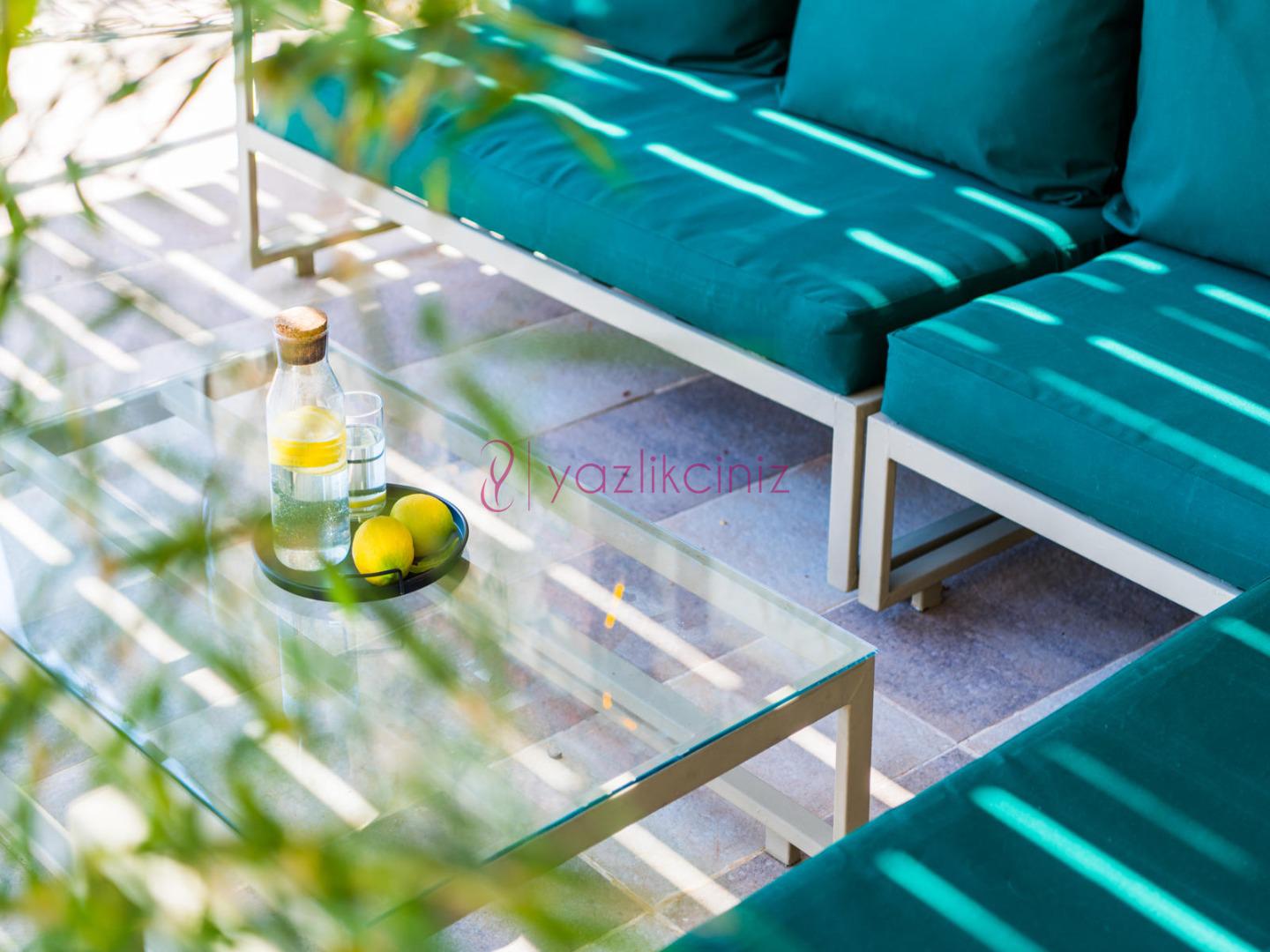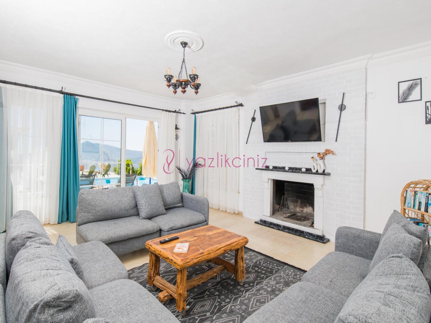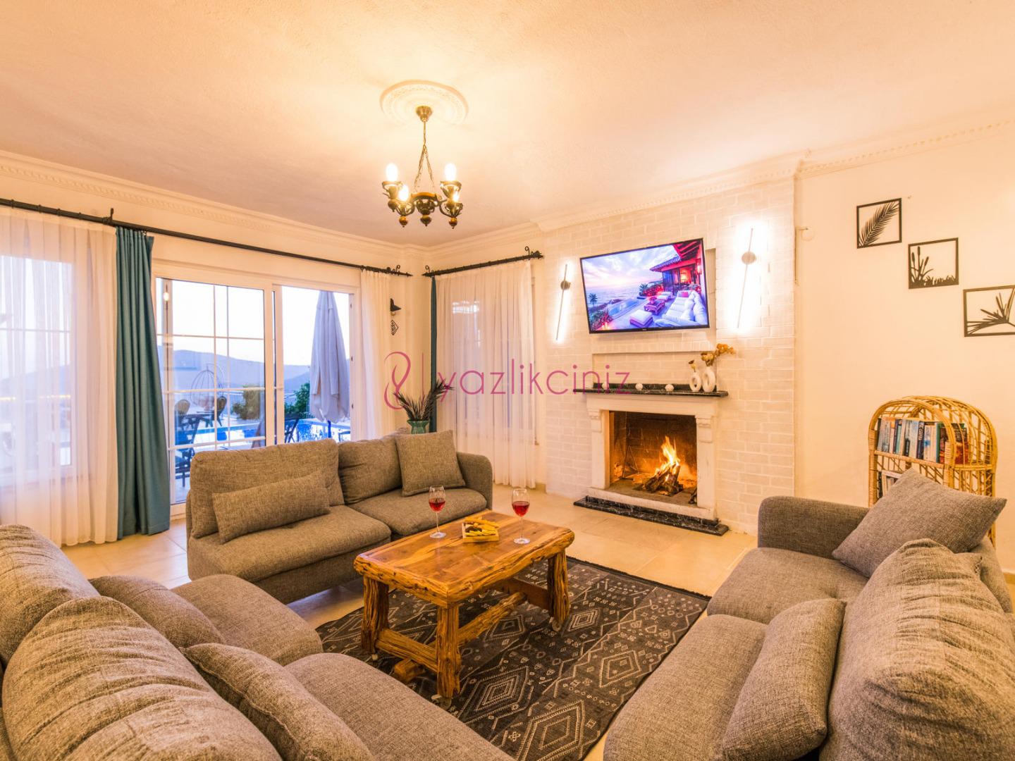 Deniz manzaralı salonunda oturma grubu, plazma televizyon, uydu alıcısı, klima, ütü ve ütü masası, sehpa ve havuz başına çıkış bulunmaktadır.