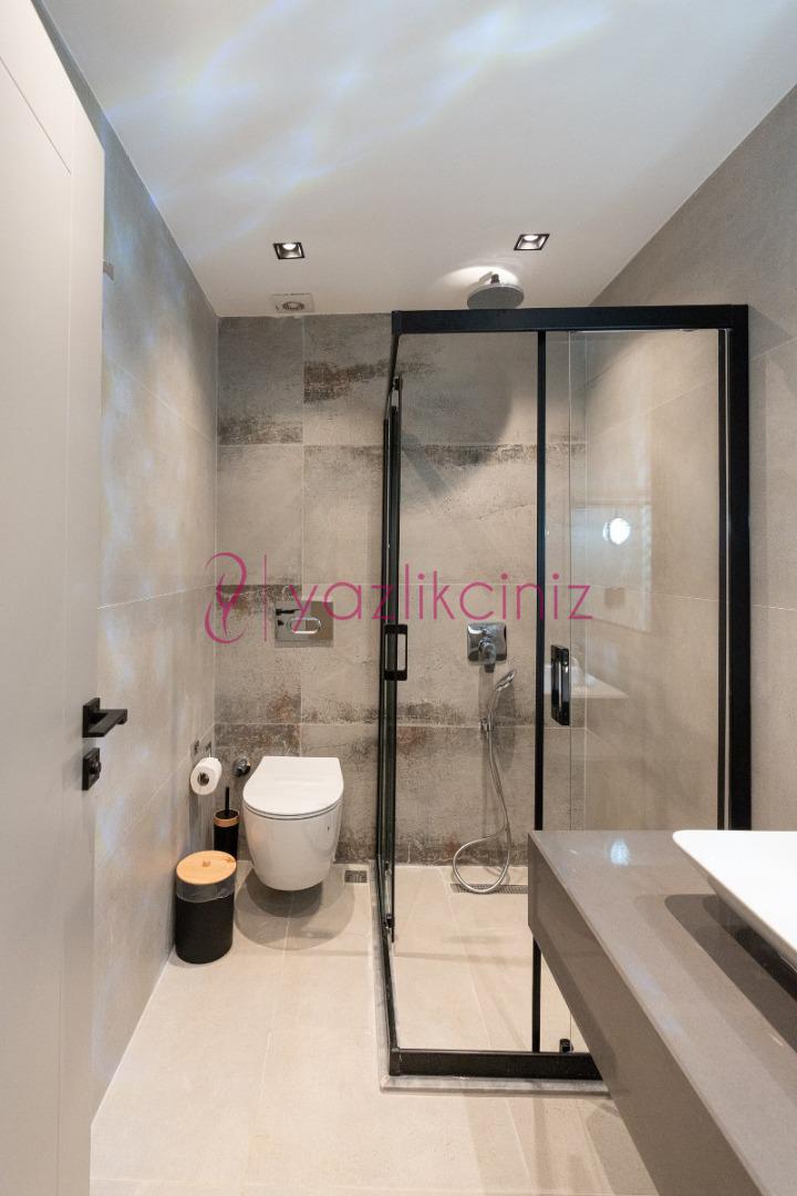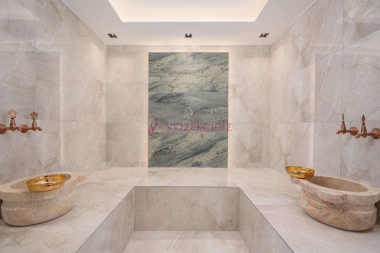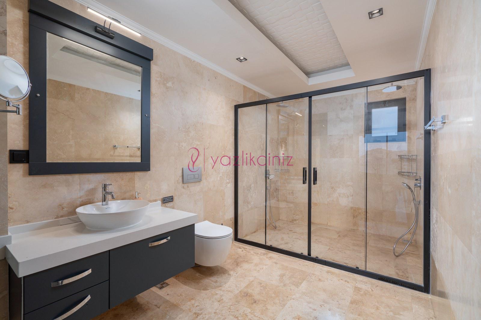 Yatak odası 5: Çift kişilik yatak, makyaj masası, klima, elbise dolabı, komodin ve ebeveyn banyosu bulunmaktadır.