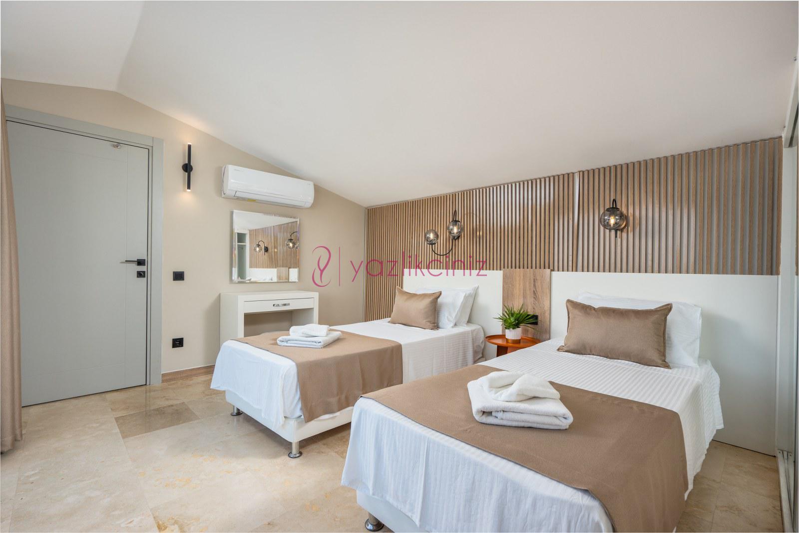 Yatak odası 3: 2 adet tek kişilik yatak makyaj masası, klima, elbise dolabı, komodin, balkon ve banyo bulunmaktadır.