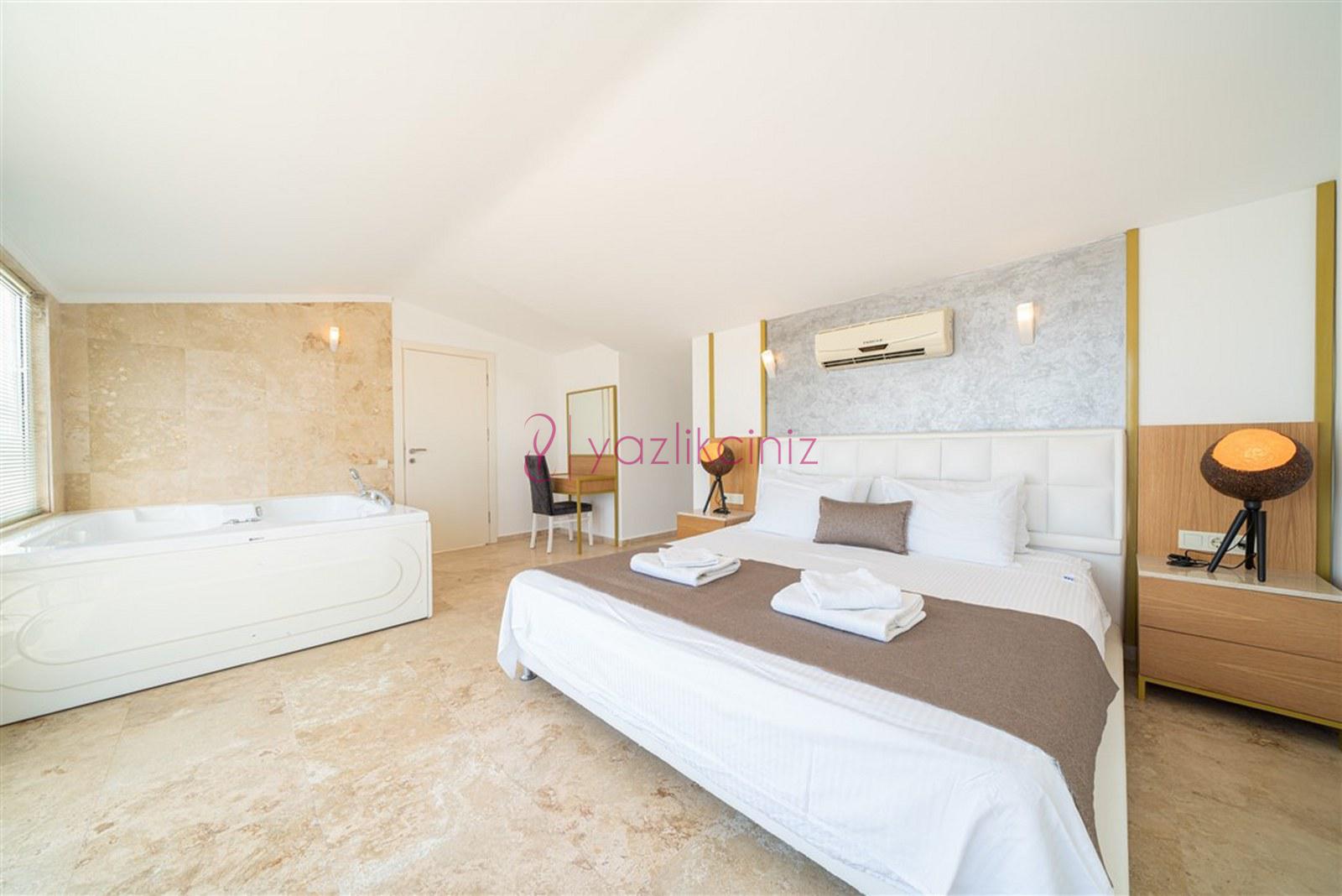 Yatak odası 1: Çift kişilik yatak, makyaj masası, klima, televizyon, elbise dolabı, jakuzi, komodin ve tuvalet ve banyosu bulunmaktadır.