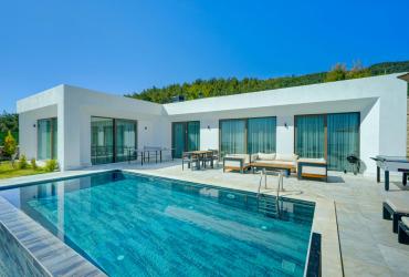 Villamızın havuzu korunaklıdır. Bahçe içerisinde güneşlenme terası, özel yüzme havuzu, şezlonglar, güneş şemsiyesi, 6 kişilik bahçe yemek masası ve sandalyeler, hamak salıncak ve mangal bulunmaktadır.