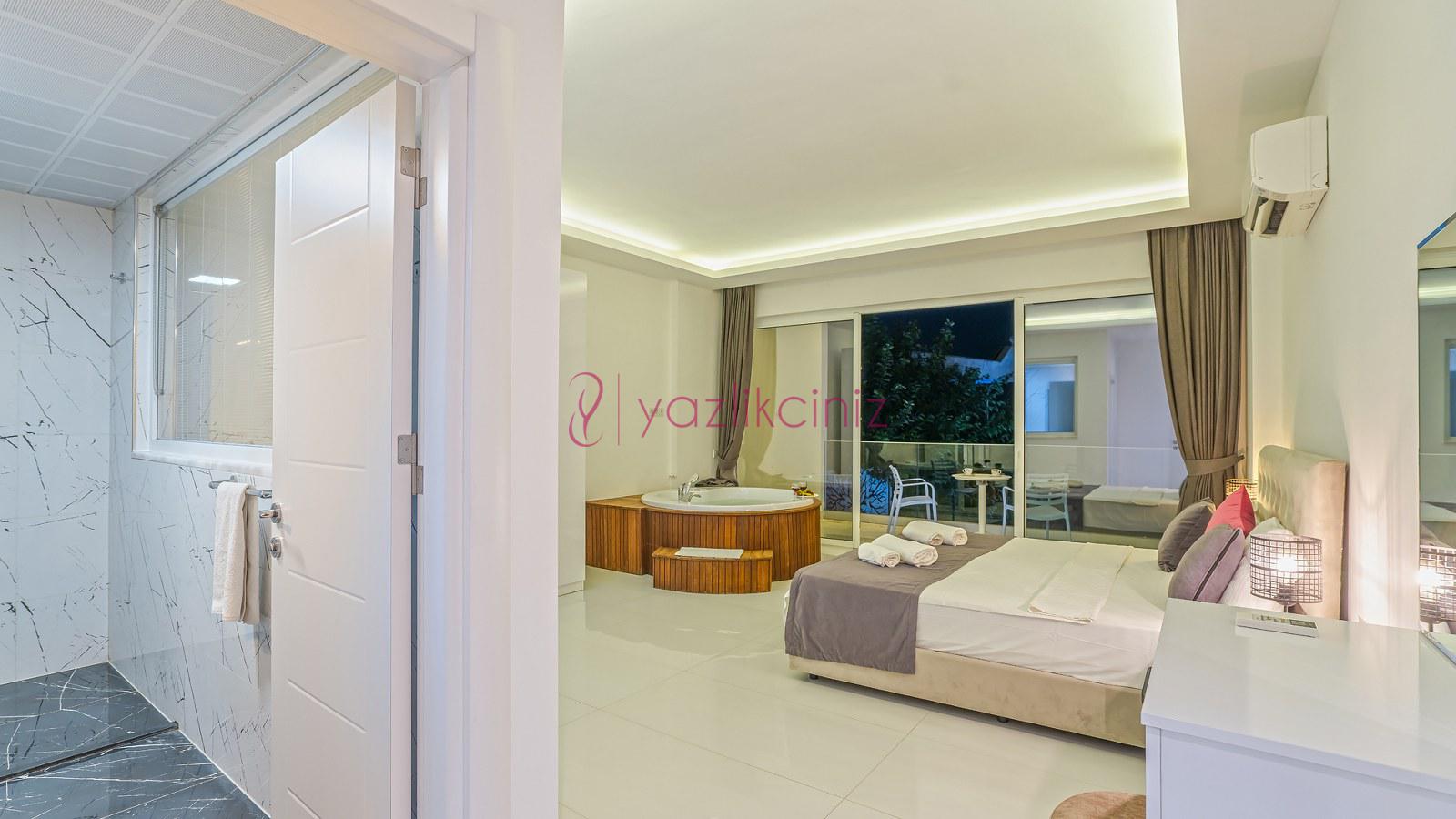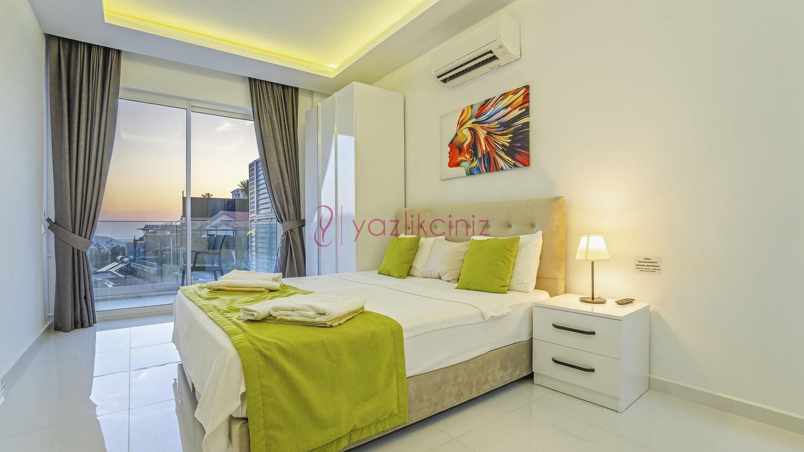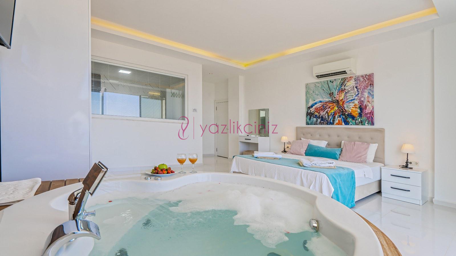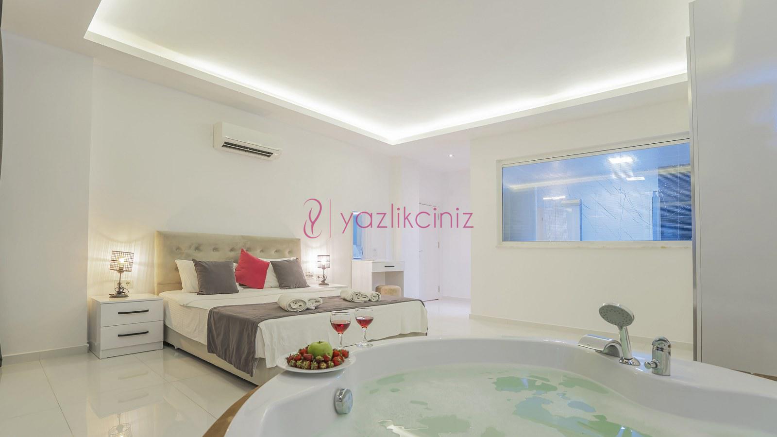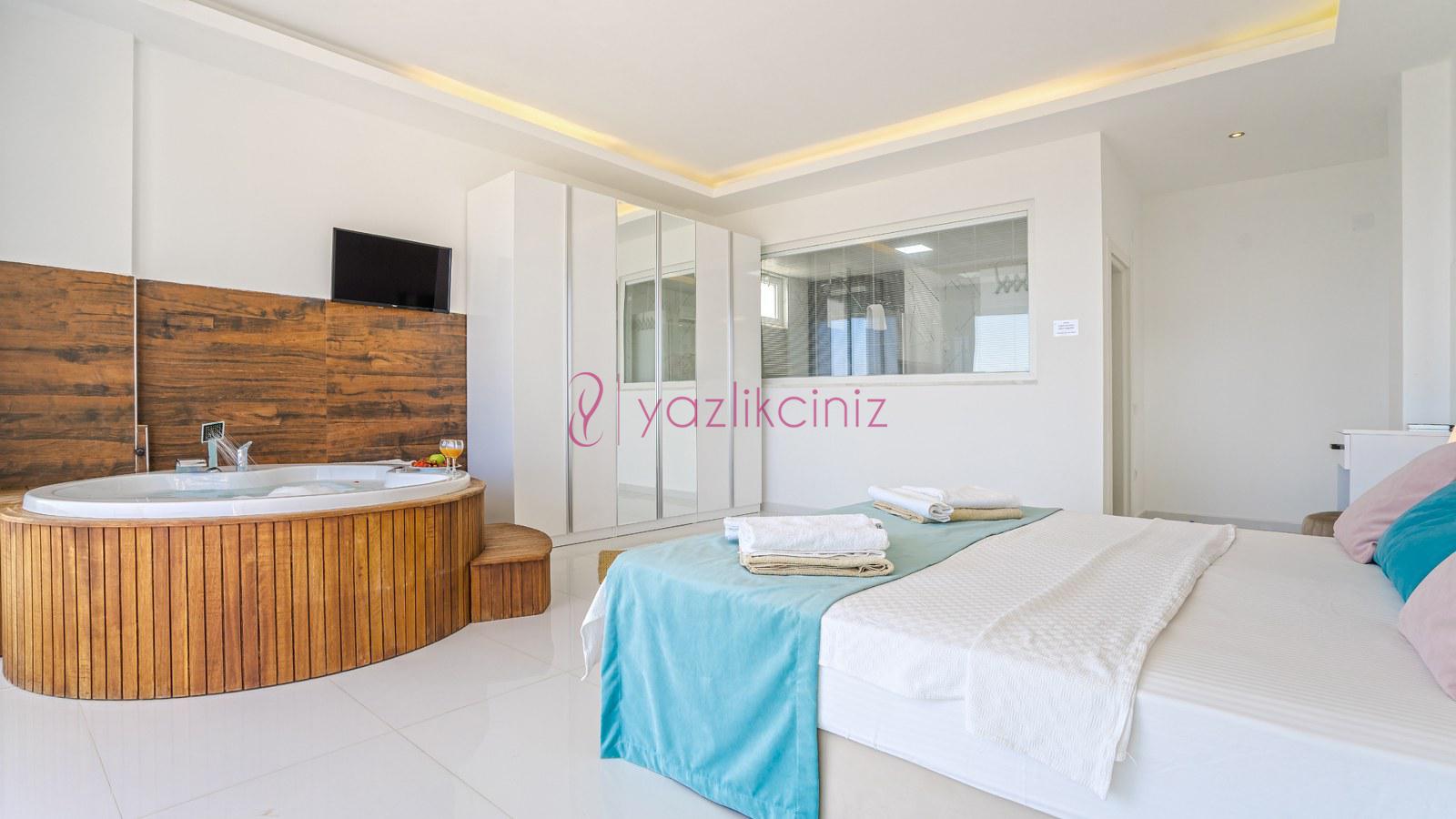2. Yatak Odası: 1 adet çift kişilik yatak, klima, elbise dolabı, jakuzi, makyaj masası, komodin, banyo ve tuvalet bulunmaktadır. Odamız deniz manzaralıdır.
