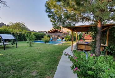 Villa Taş Ev havuz terasında özel yüzme havuzu, şezlonglar, güneş şemsiyesi, bahçe mobilyaları, köşk, oturma alanı ve mangal bulunmaktadır.