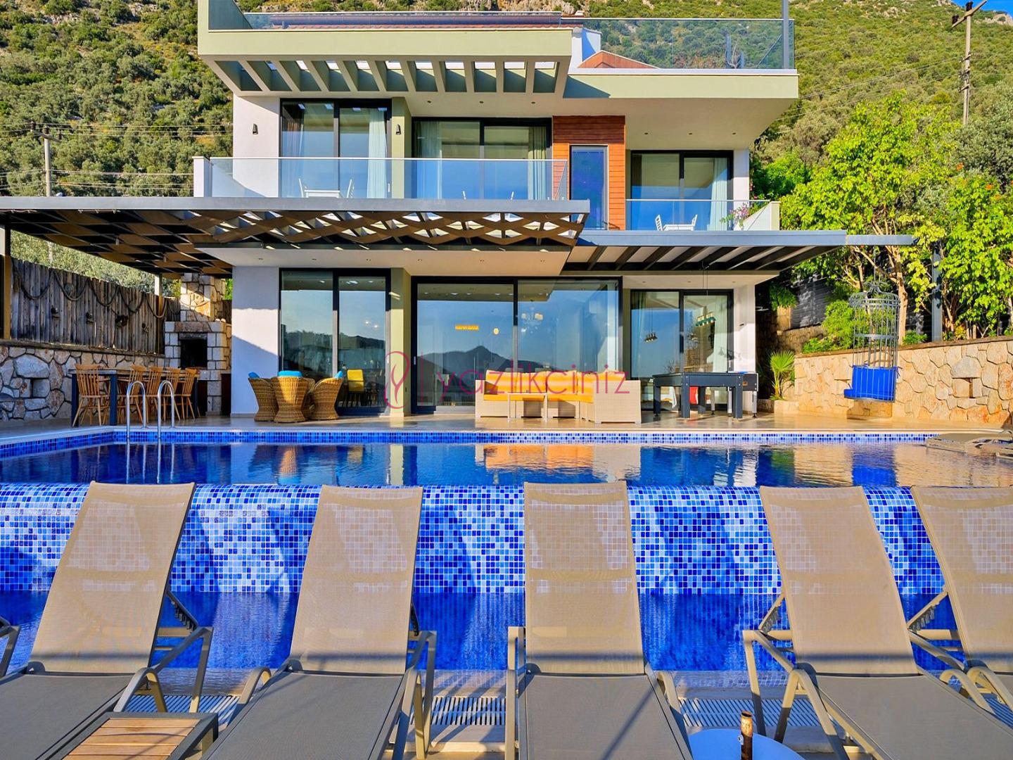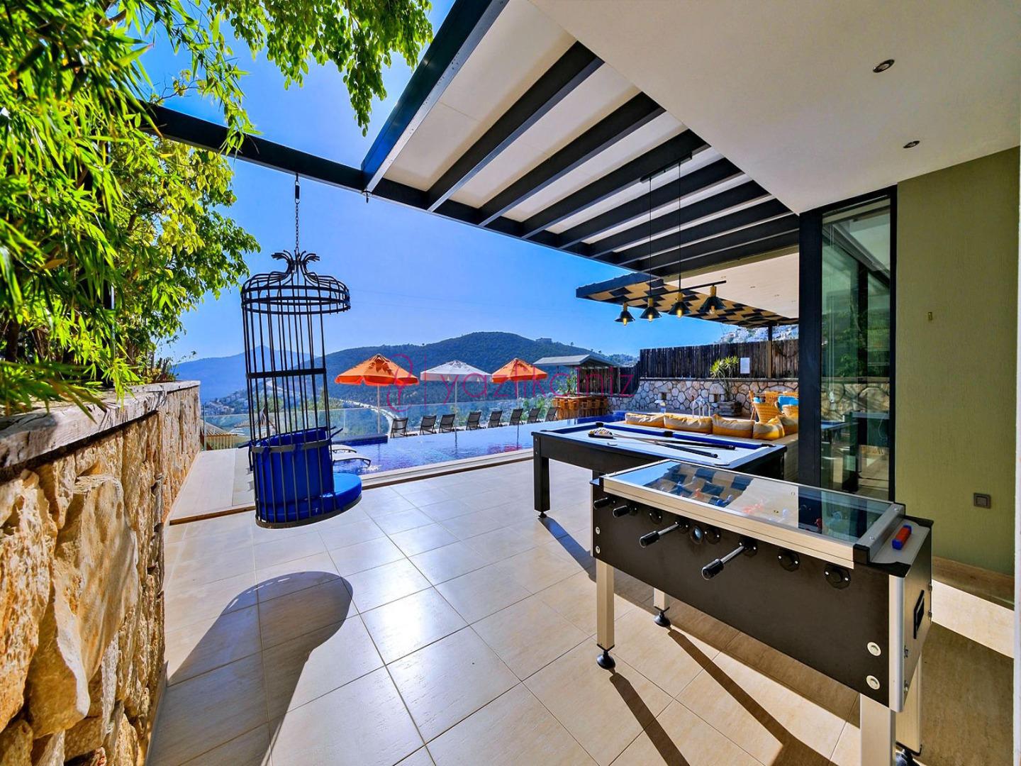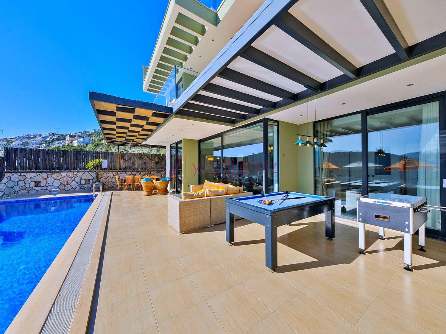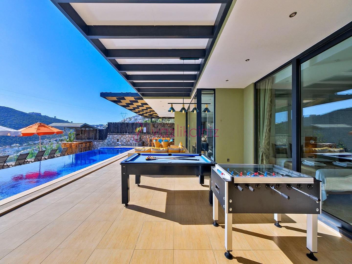 Havuz terasında şezlong, şemsiye, salıncak, bahçe oturma grubu, yemek masası, mangal, bilardo, masa tenisi bulunmaktadır.