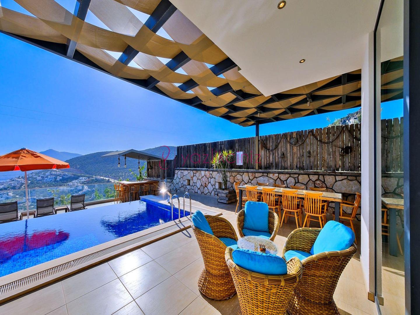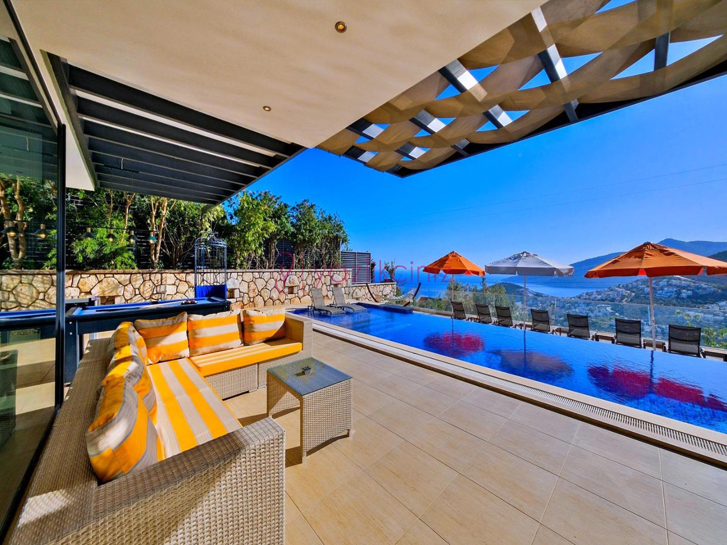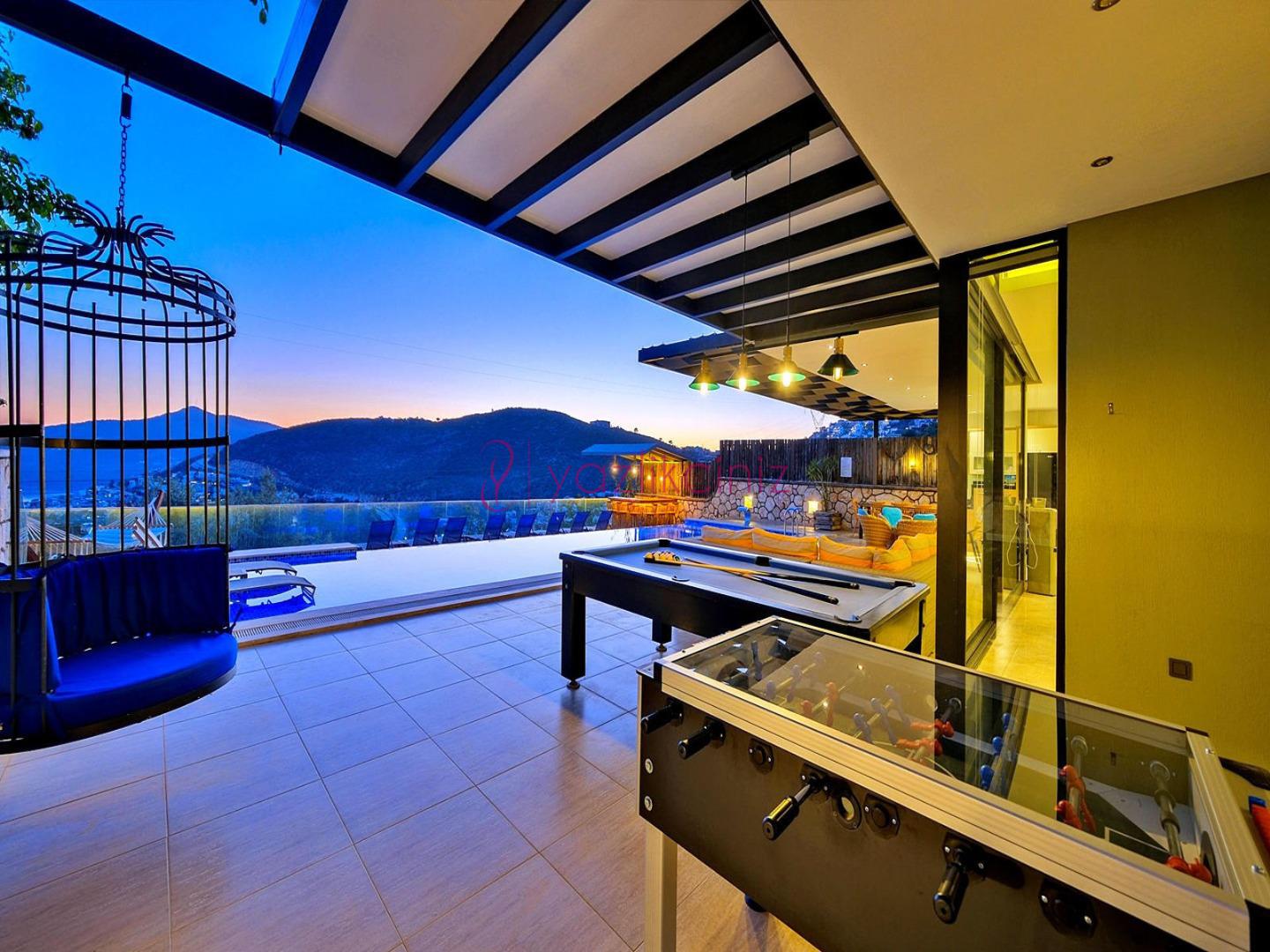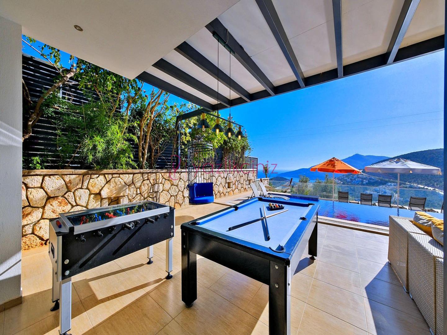 Havuz terasında şezlong, şemsiye, salıncak, bahçe oturma grubu, yemek masası, mangal, bilardo, masa tenisi bulunmaktadır.