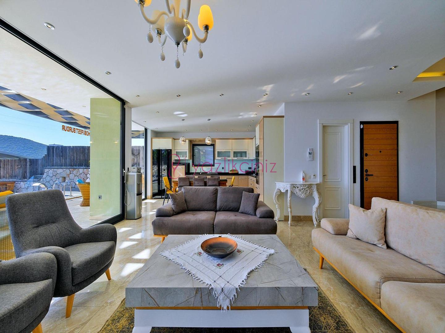 Salonumuzda oturma grubu, televizyon, uydu alıcısı, internet, klima, orta sehpa ve havuz terasına çıkış bulunmaktadır.