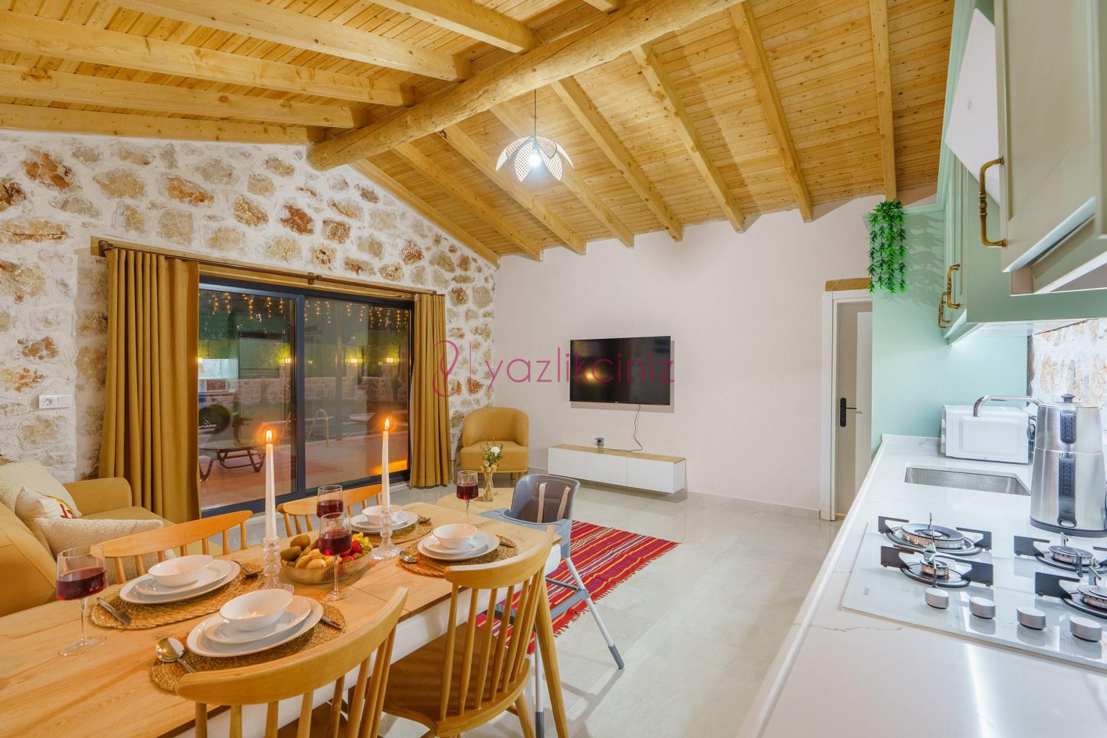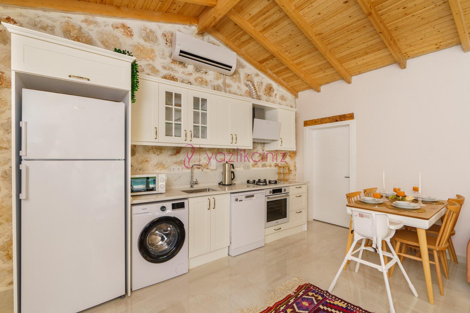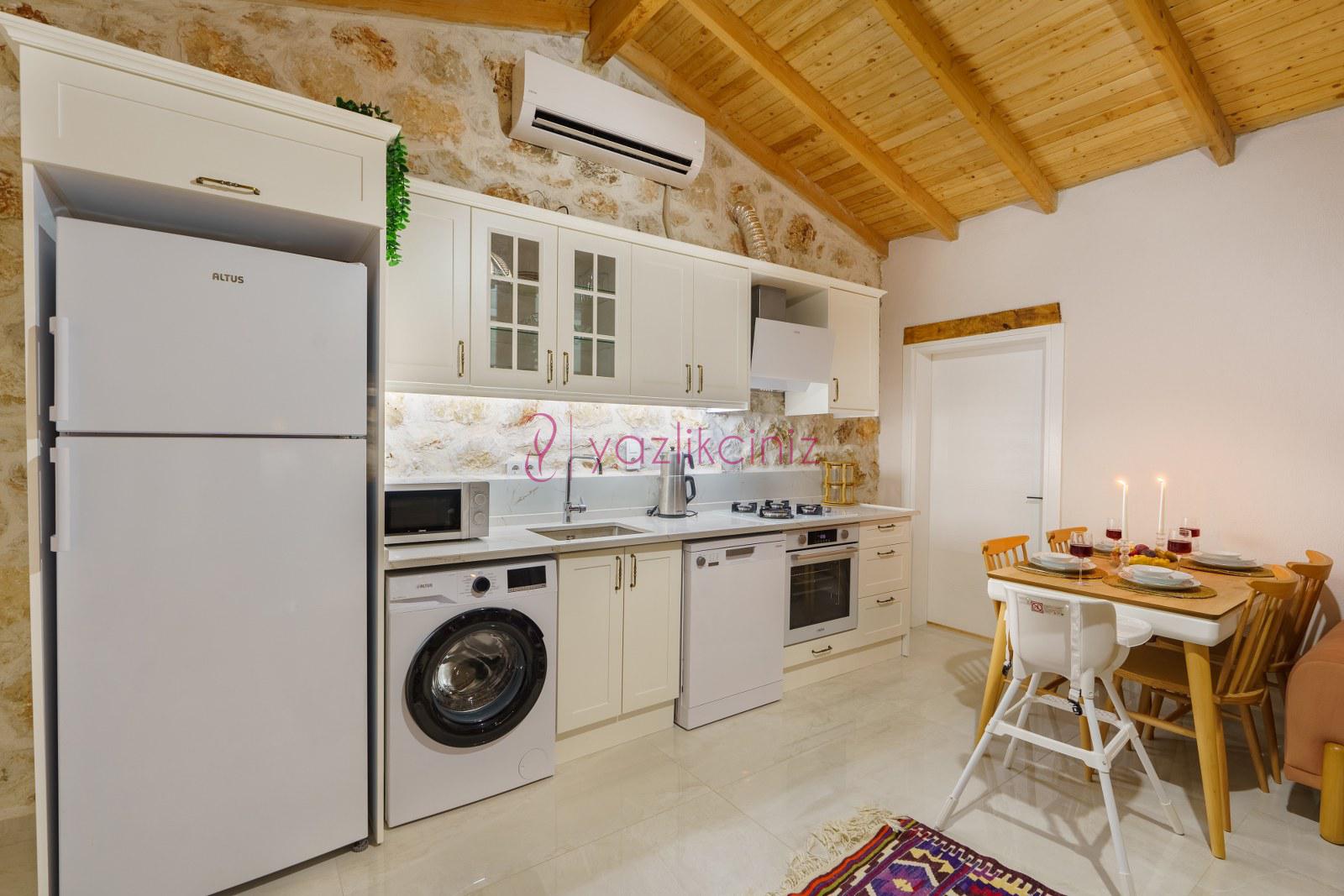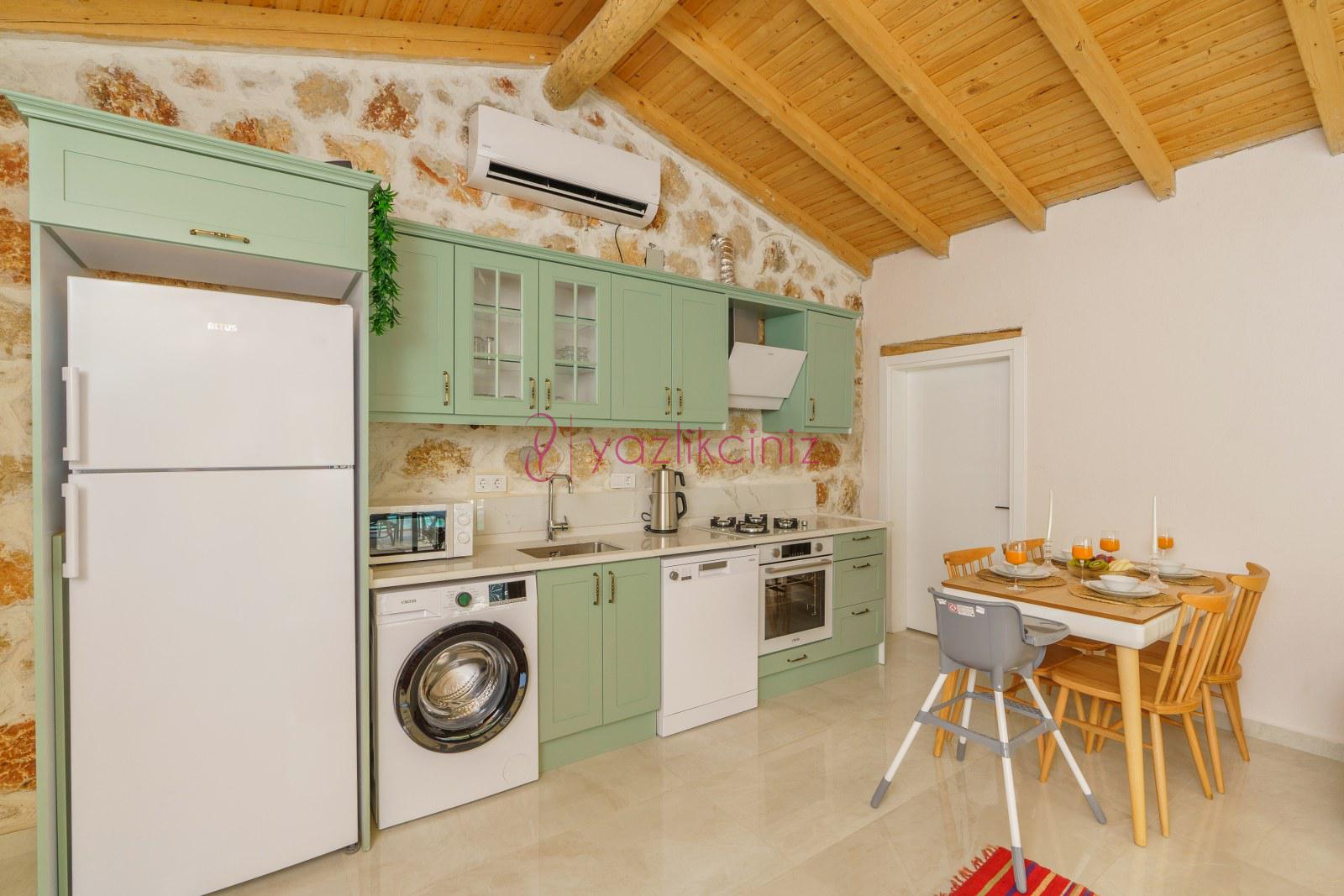Modern Amerikan mutfakta, bulaşık makinesi, çamaşır makinesi,ankastre 4’lü ocak,ankastre fırın,kettle, buzdolabı, tencere ve tava takımı, 4 kişilik yemek takımı, kaşık ve çatal seti ve bardaklar bulunmaktadır. Mutfak bölümünden de havuz terasına çıkılabilmektedir.