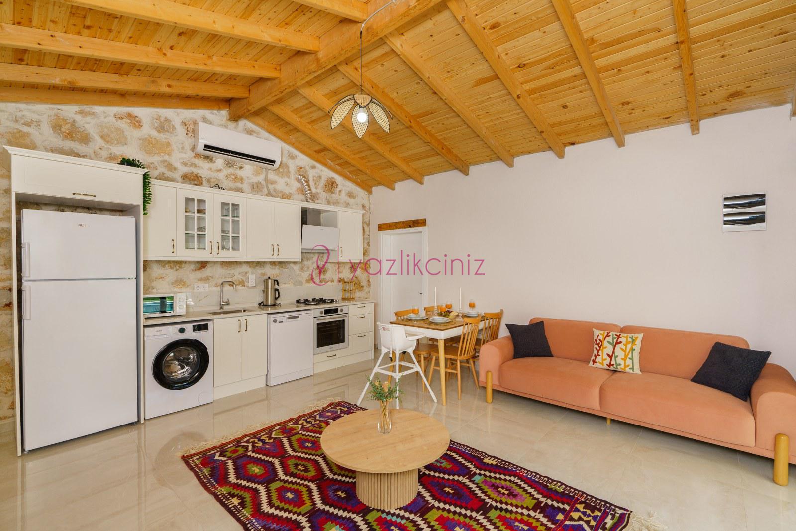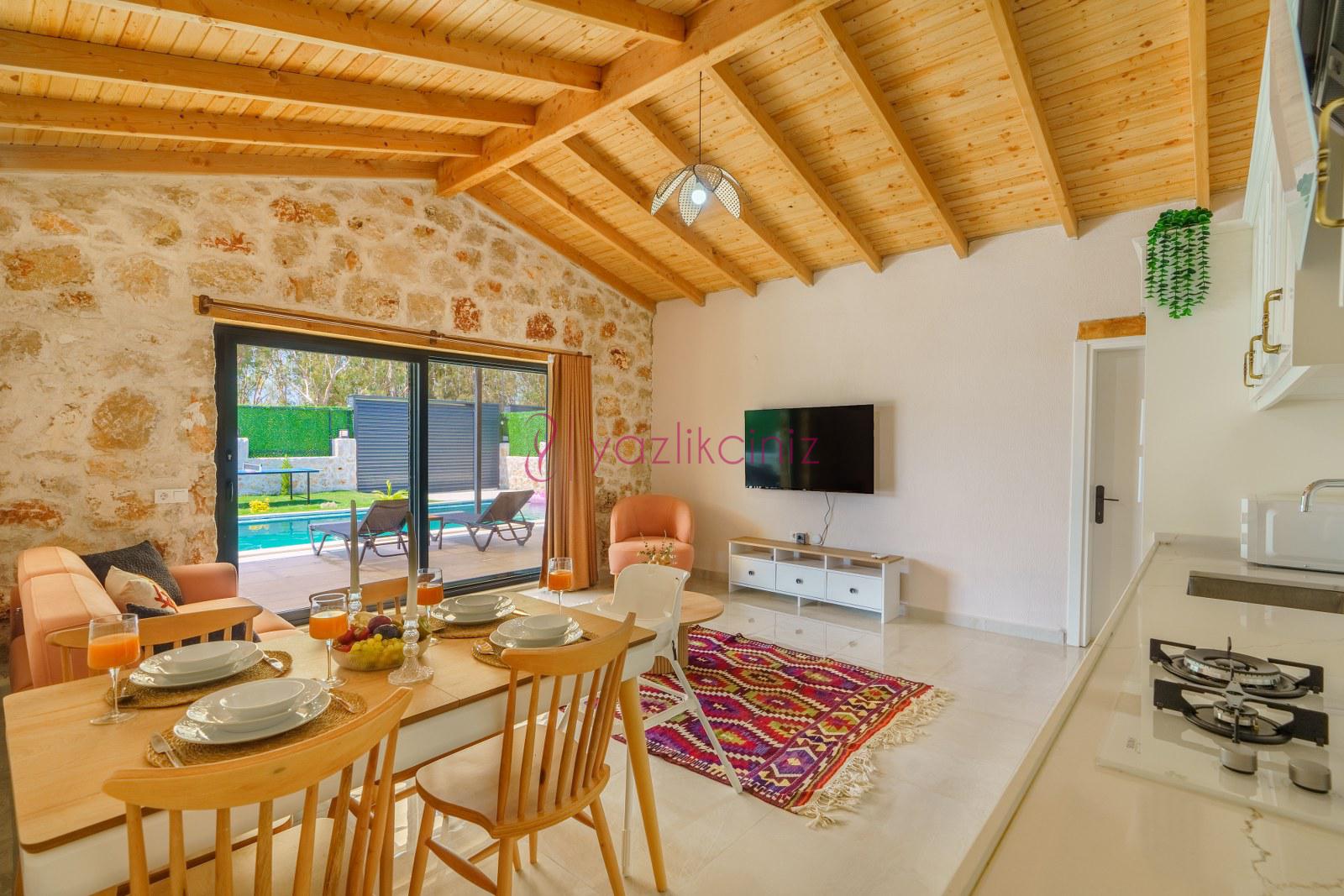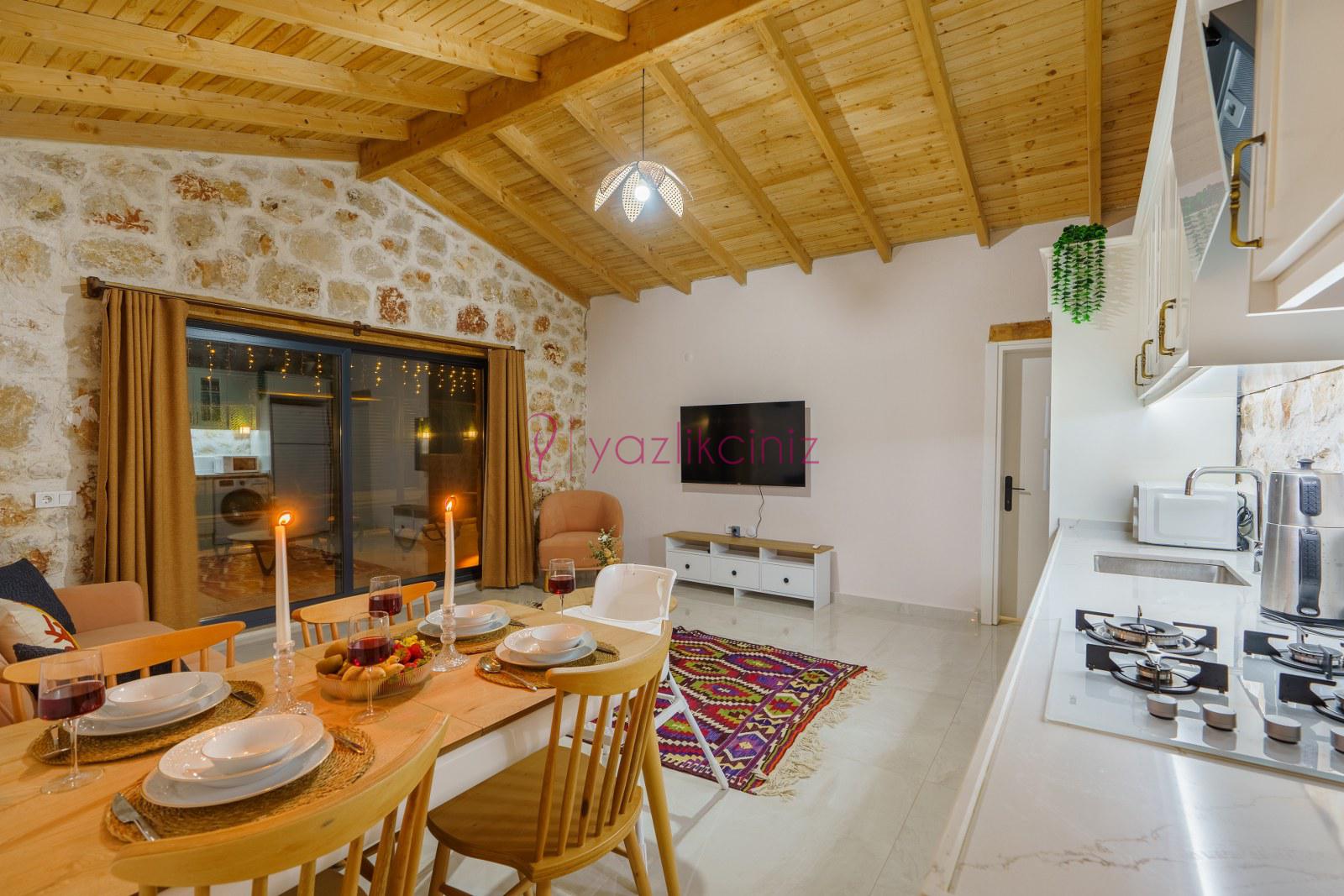Modern Amerikan mutfakta, bulaşık makinesi, çamaşır makinesi,ankastre 4’lü ocak,ankastre fırın,kettle, buzdolabı, tencere ve tava takımı, 4 kişilik yemek takımı, kaşık ve çatal seti ve bardaklar bulunmaktadır. Mutfak bölümünden de havuz terasına çıkılabilmektedir.