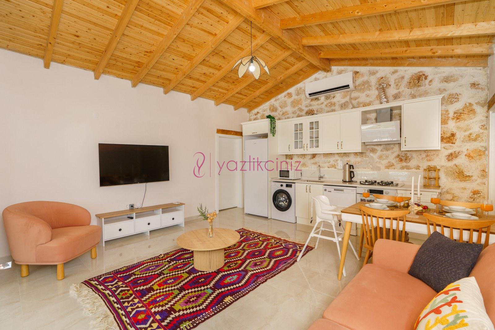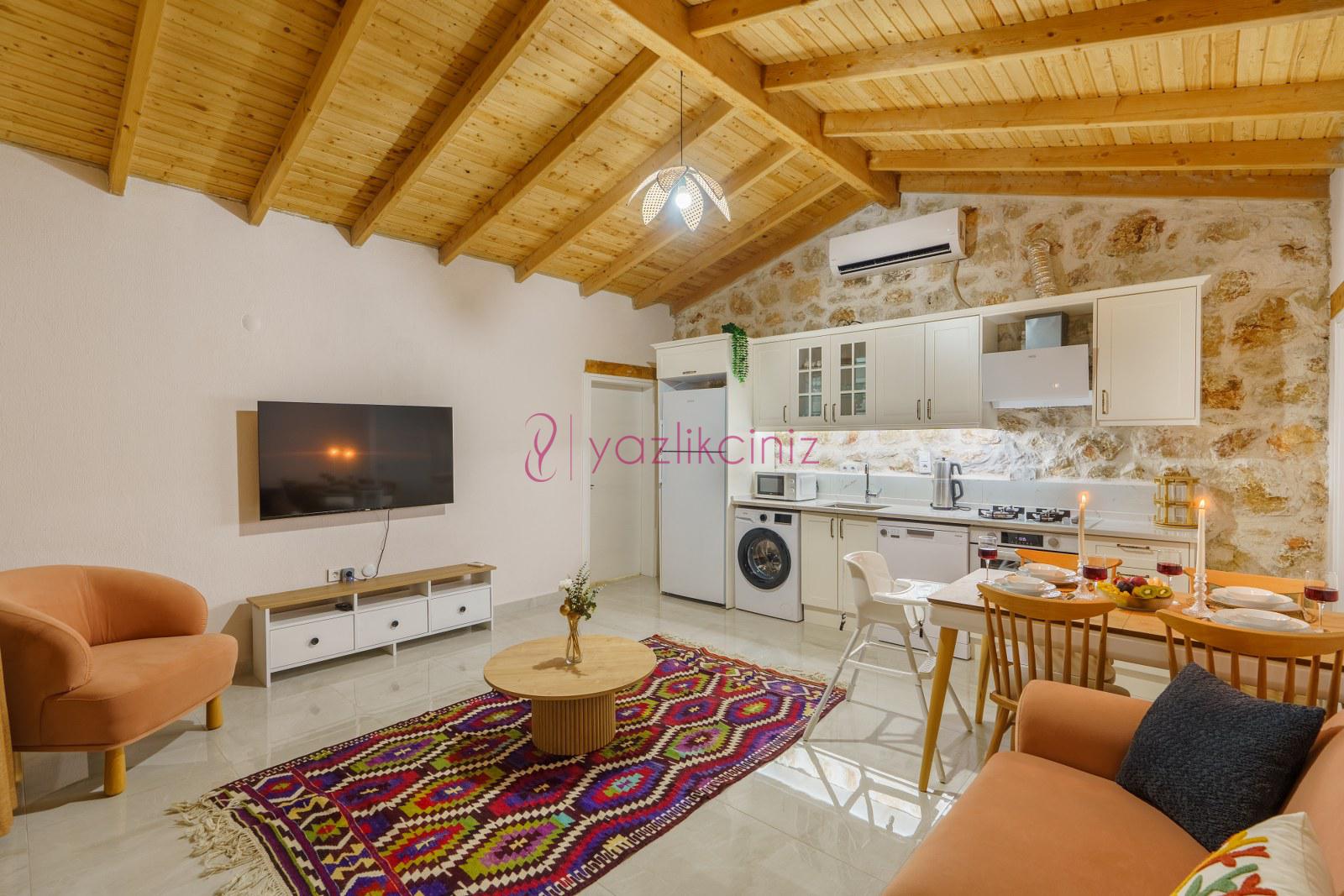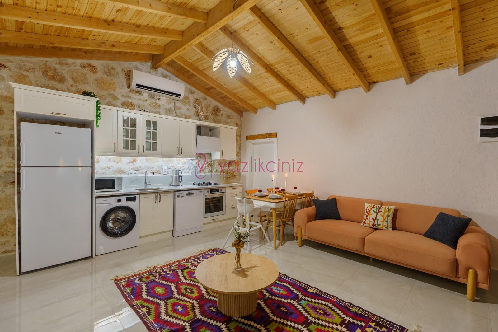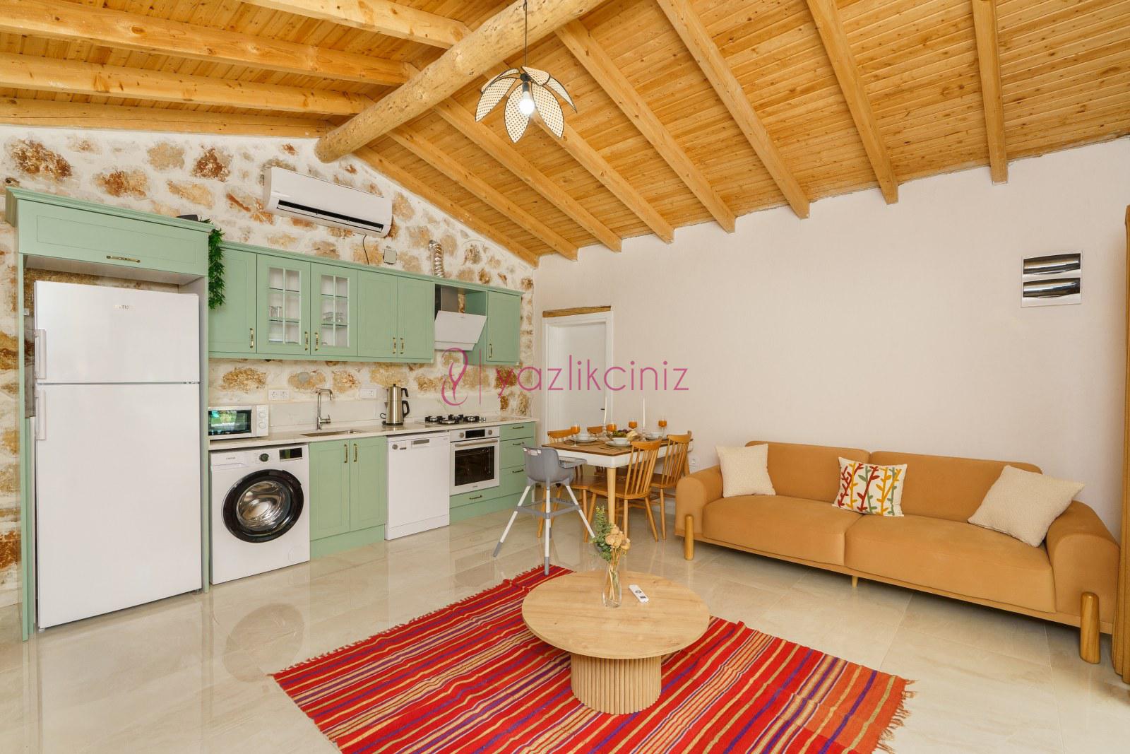 Modern Amerikan mutfakta, bulaşık makinesi, çamaşır makinesi,ankastre 4’lü ocak,ankastre fırın,kettle, buzdolabı, tencere ve tava takımı, 4 kişilik yemek takımı, kaşık ve çatal seti ve bardaklar bulunmaktadır. Mutfak bölümünden de havuz terasına çıkılabilmektedir.
