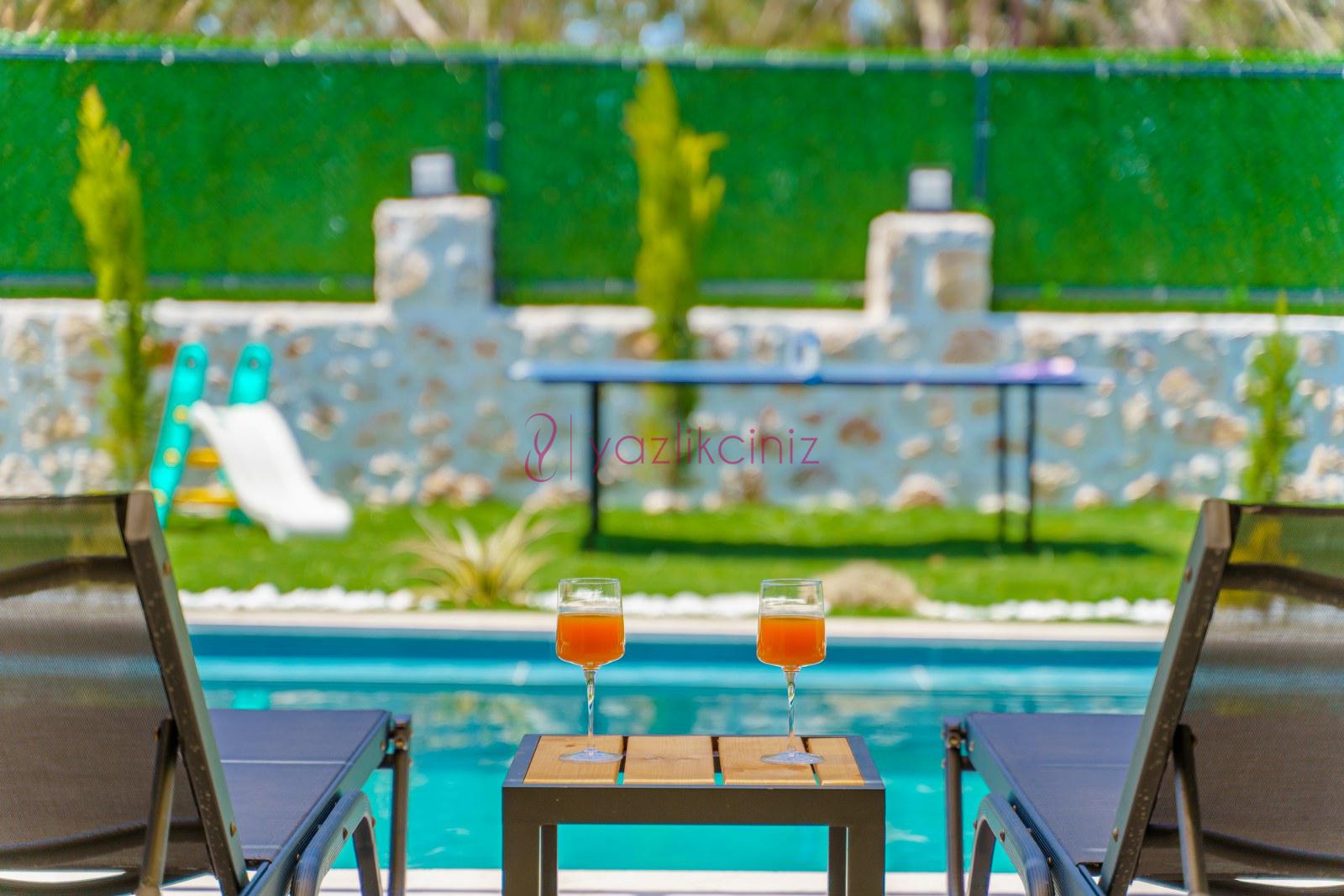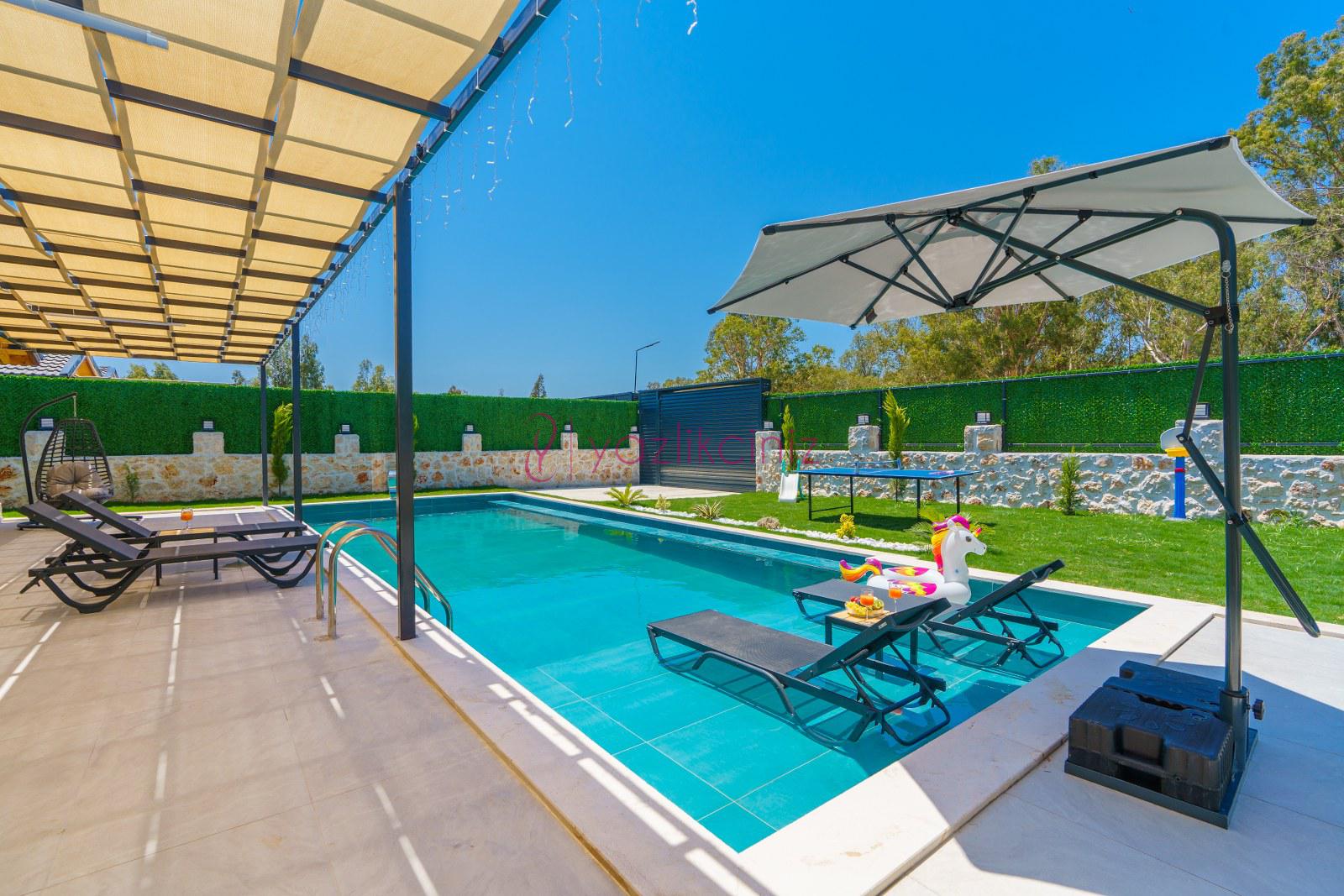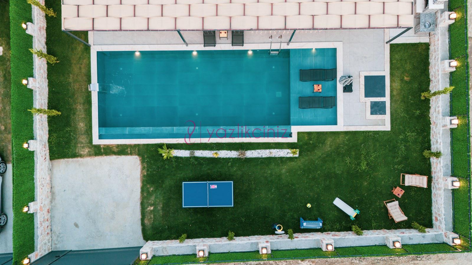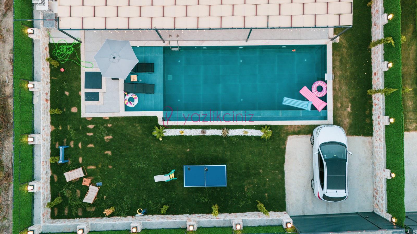 Havuz terasında, korunaklı özel yüzme havuzu, şezlong, şemsiye, yemek masası, oturma grubu çardak ve barbekü (mangal) bulunmaktadır.