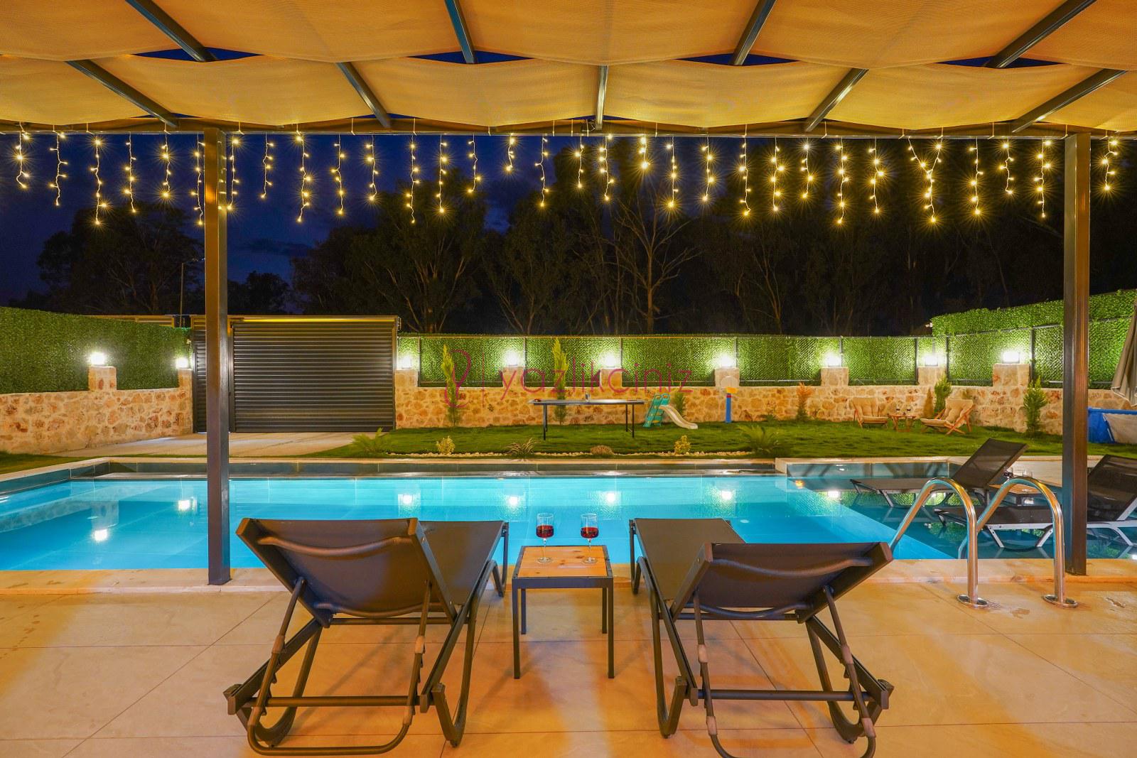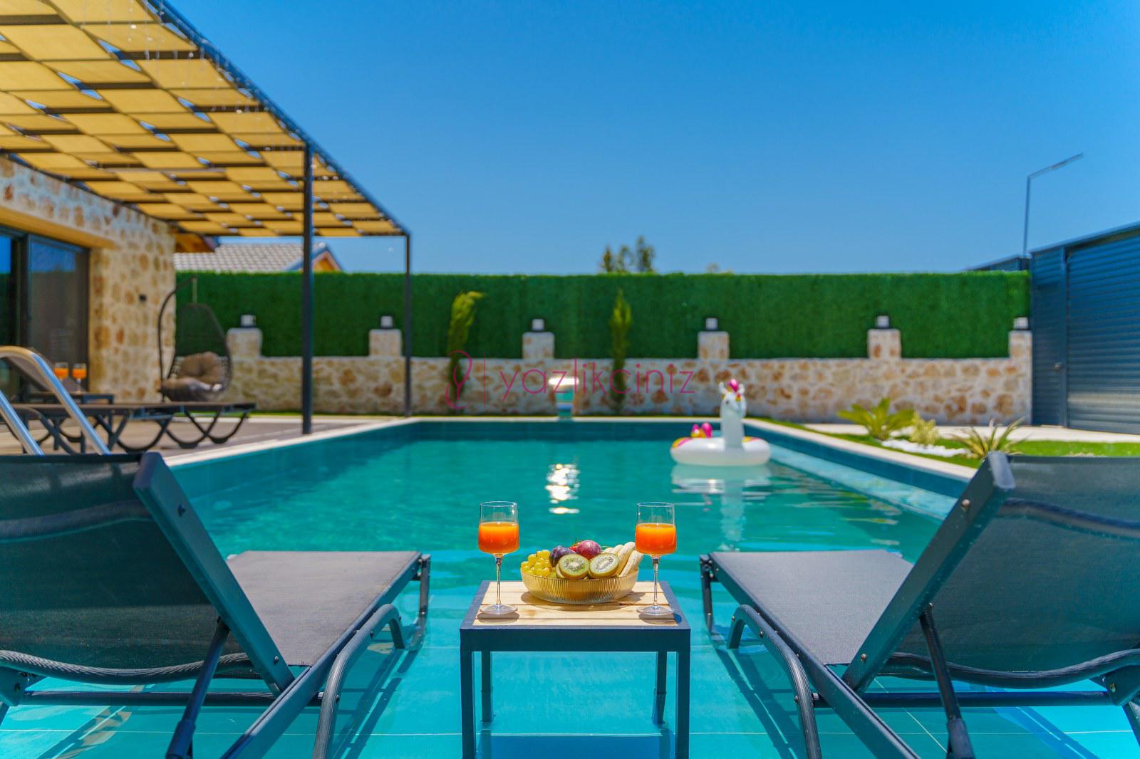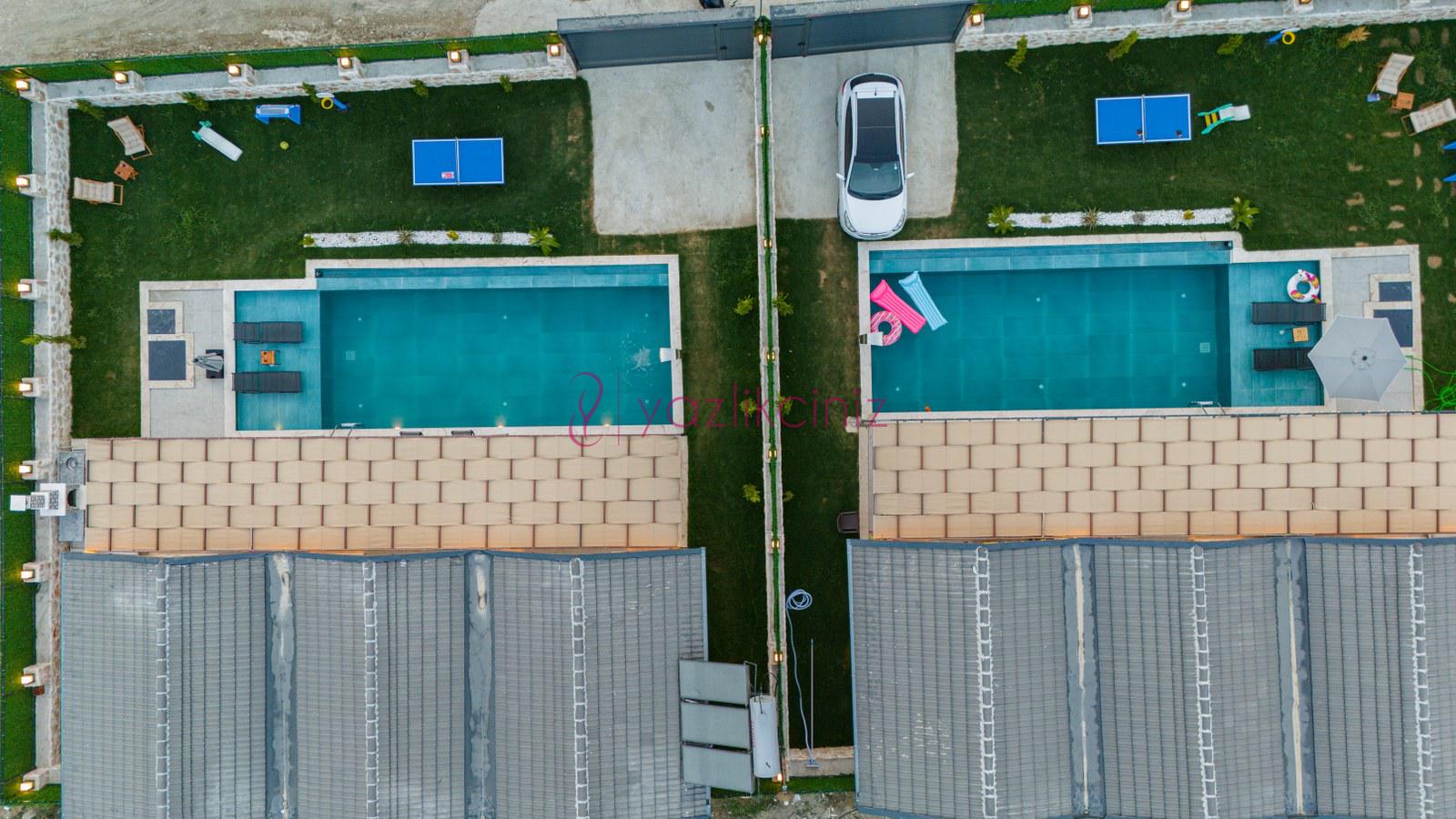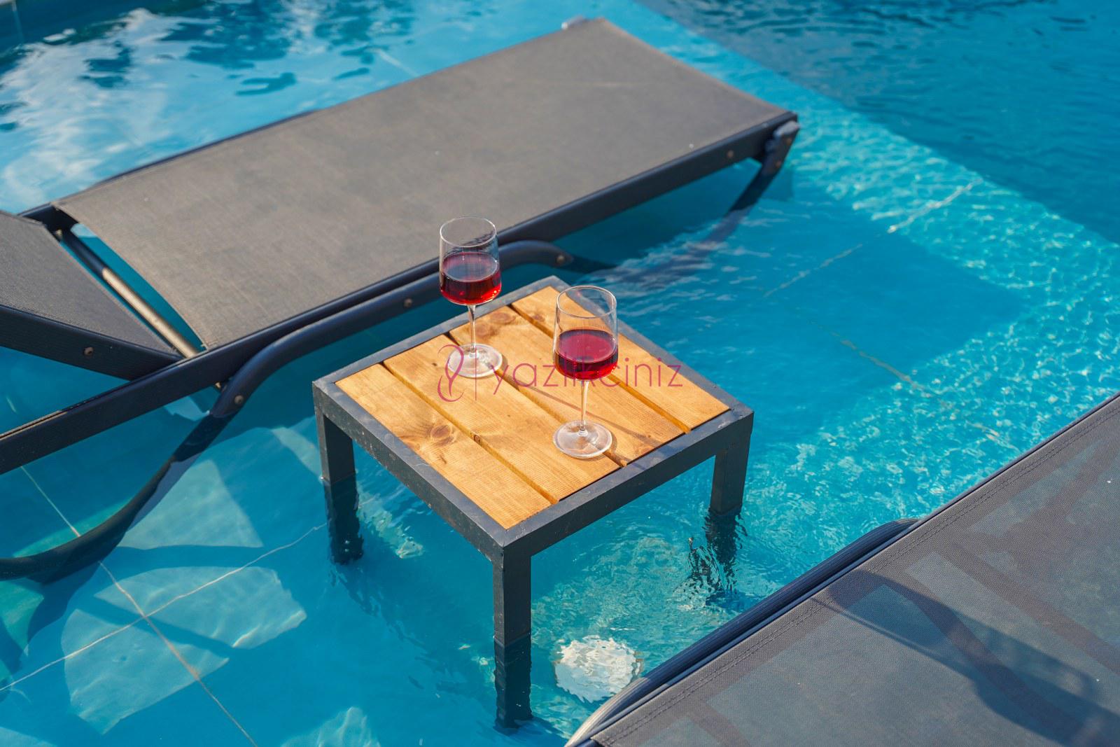 Havuz terasında, korunaklı özel yüzme havuzu, şezlong, şemsiye, yemek masası, oturma grubu çardak ve barbekü (mangal) bulunmaktadır.