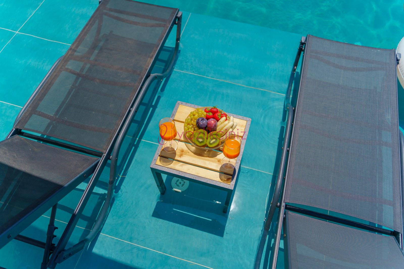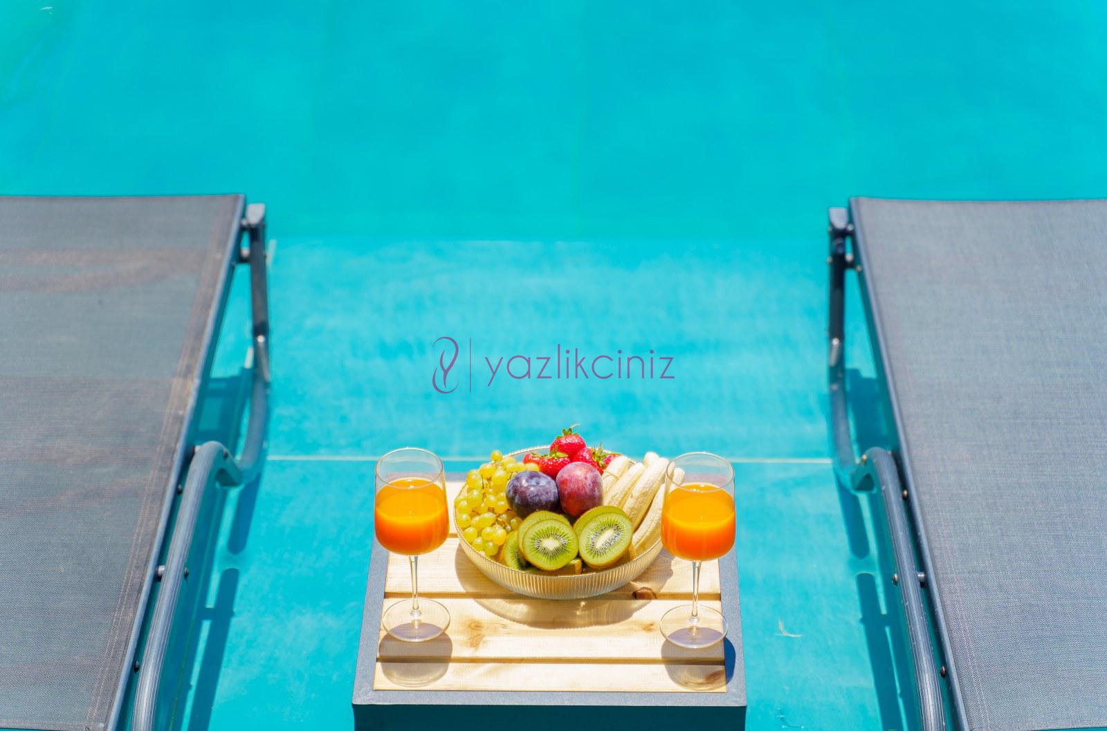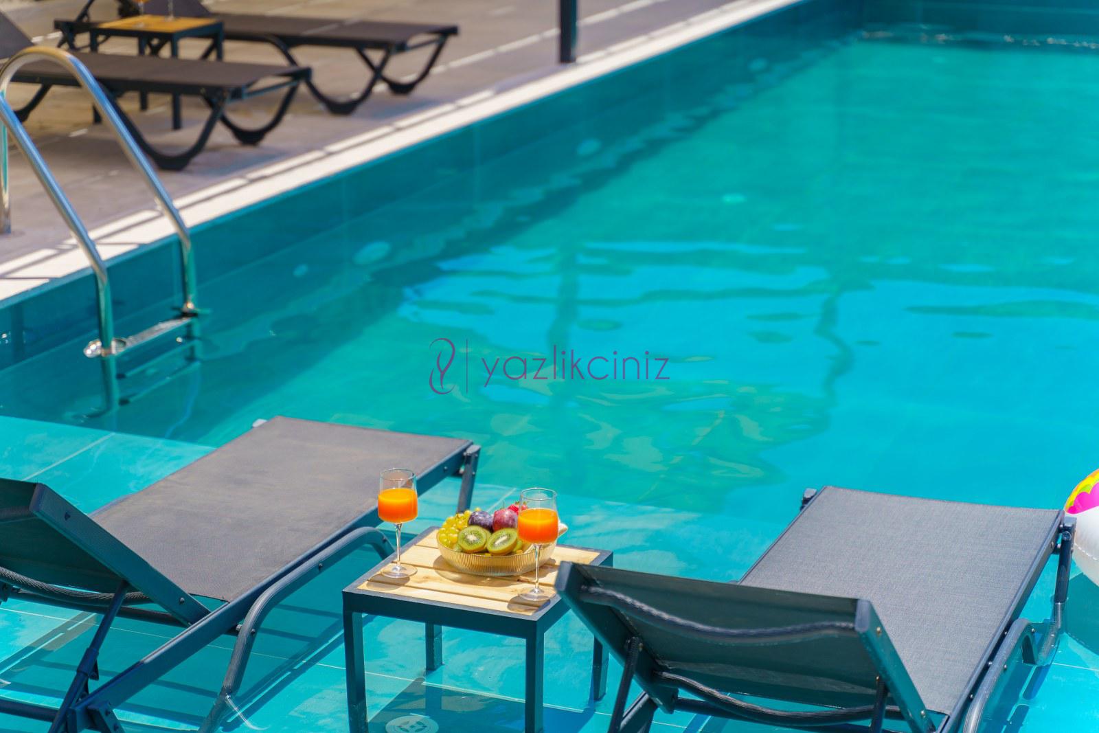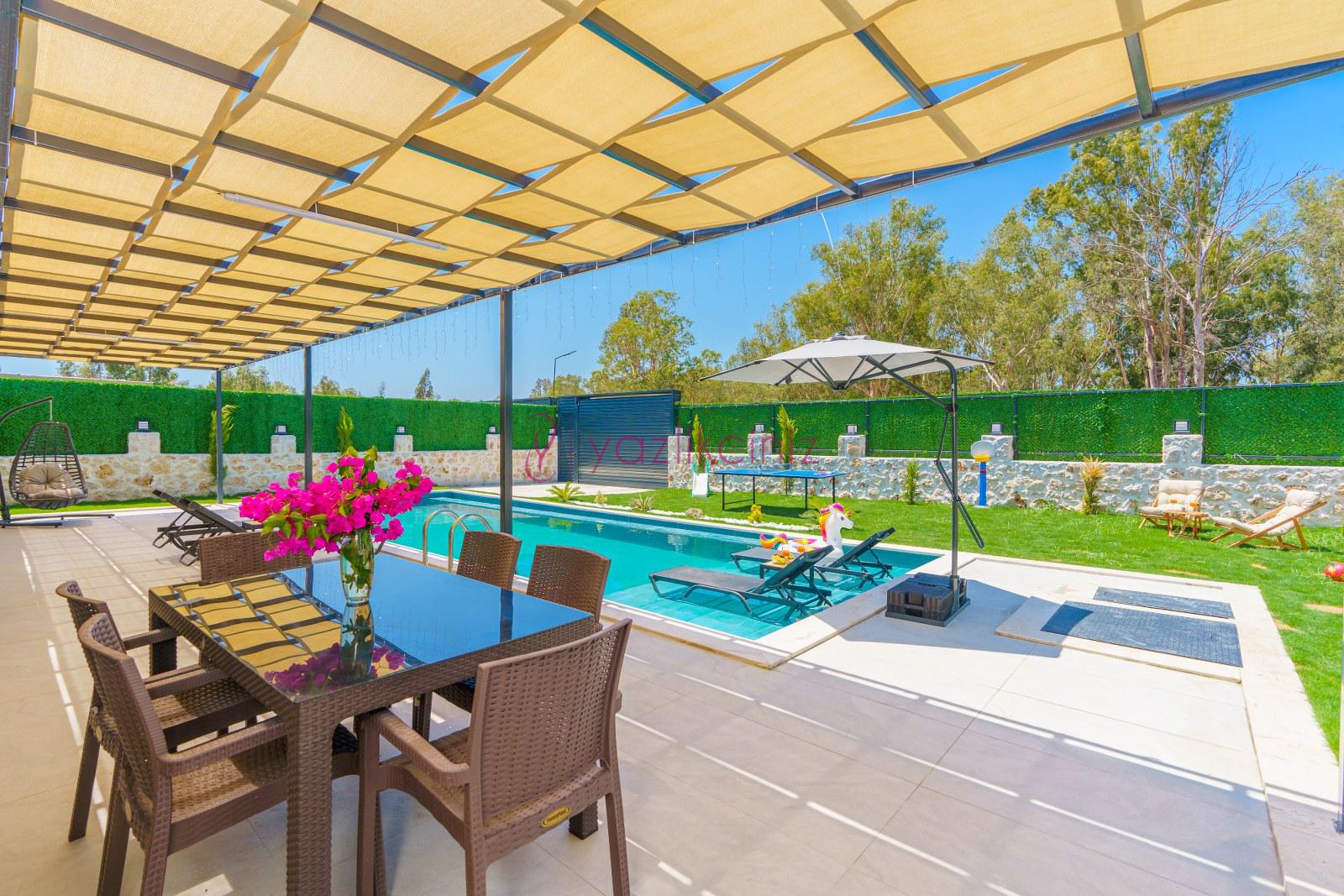 Havuz terasında, korunaklı özel yüzme havuzu, şezlong, şemsiye, yemek masası, oturma grubu çardak ve barbekü (mangal) bulunmaktadır.