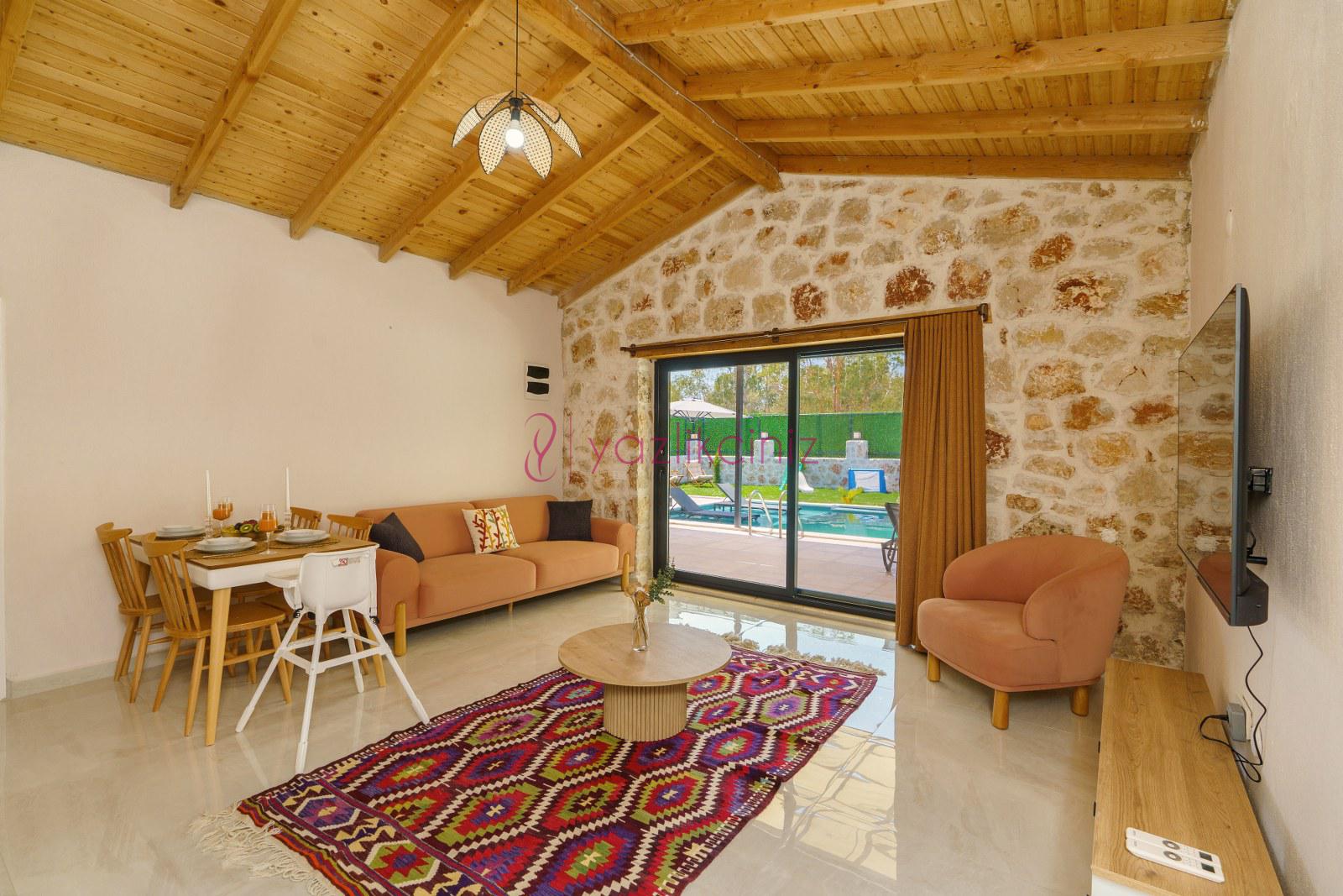 Oldukça şık dekore edilmiş salonda, oturma grubu, TV, uydu alıcı ve klima yer almaktadır. Ayrıca salondan havuz terasına çıkışta bulunmaktadır.