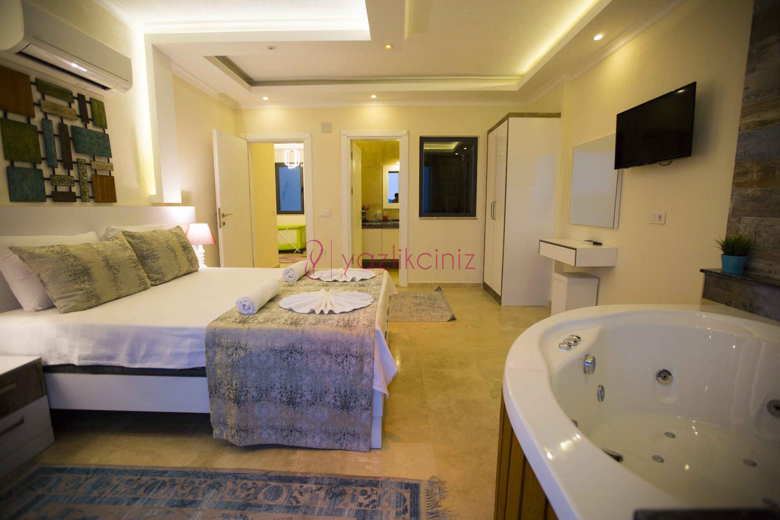 1. Yatak Odası: Süit oda, 1 adet çift kişilik yatak, klima, komodin, elbise dolabı, jakuzi, wc, banyo ve balkon bulunmaktadır.