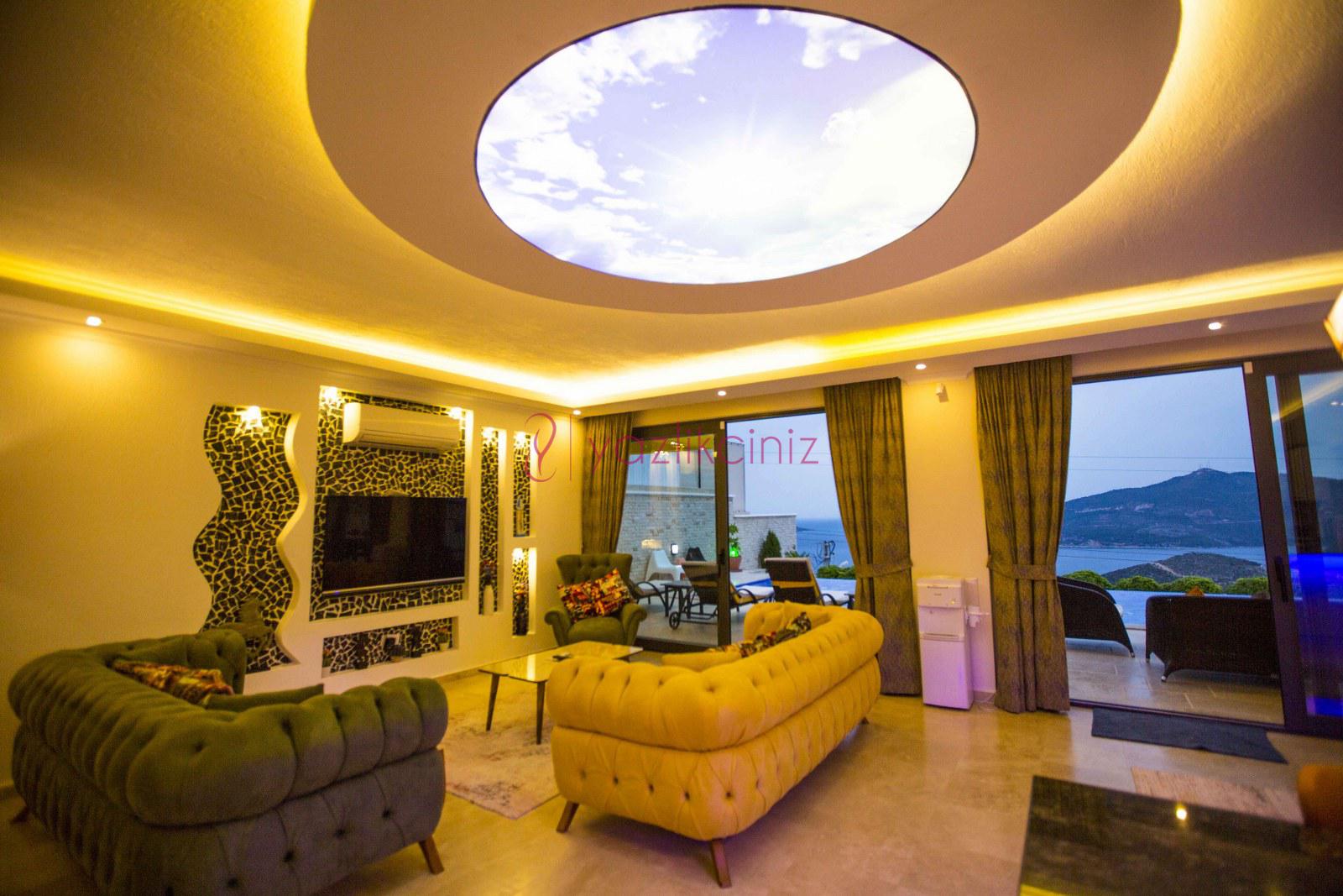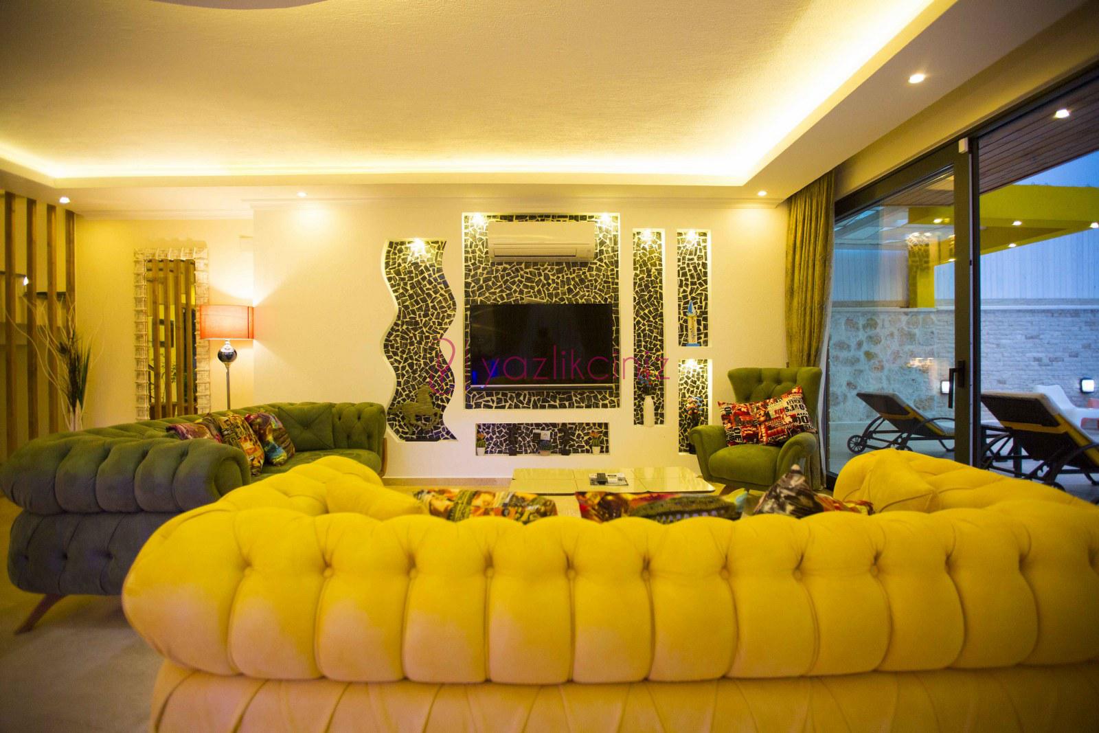 Salonumuzda, şık ve rahat oturma grubu, orta sehpa, TV, klima, uydu alıcı, WiFi ve WC bulunmaktadır.
