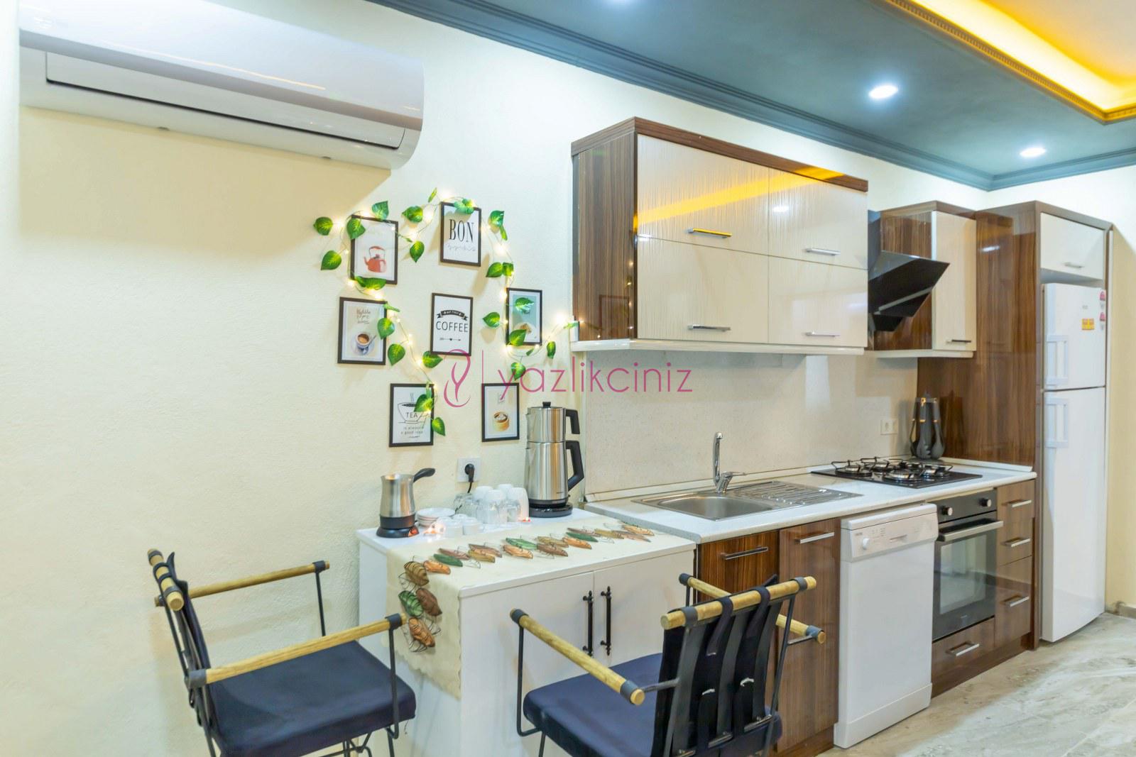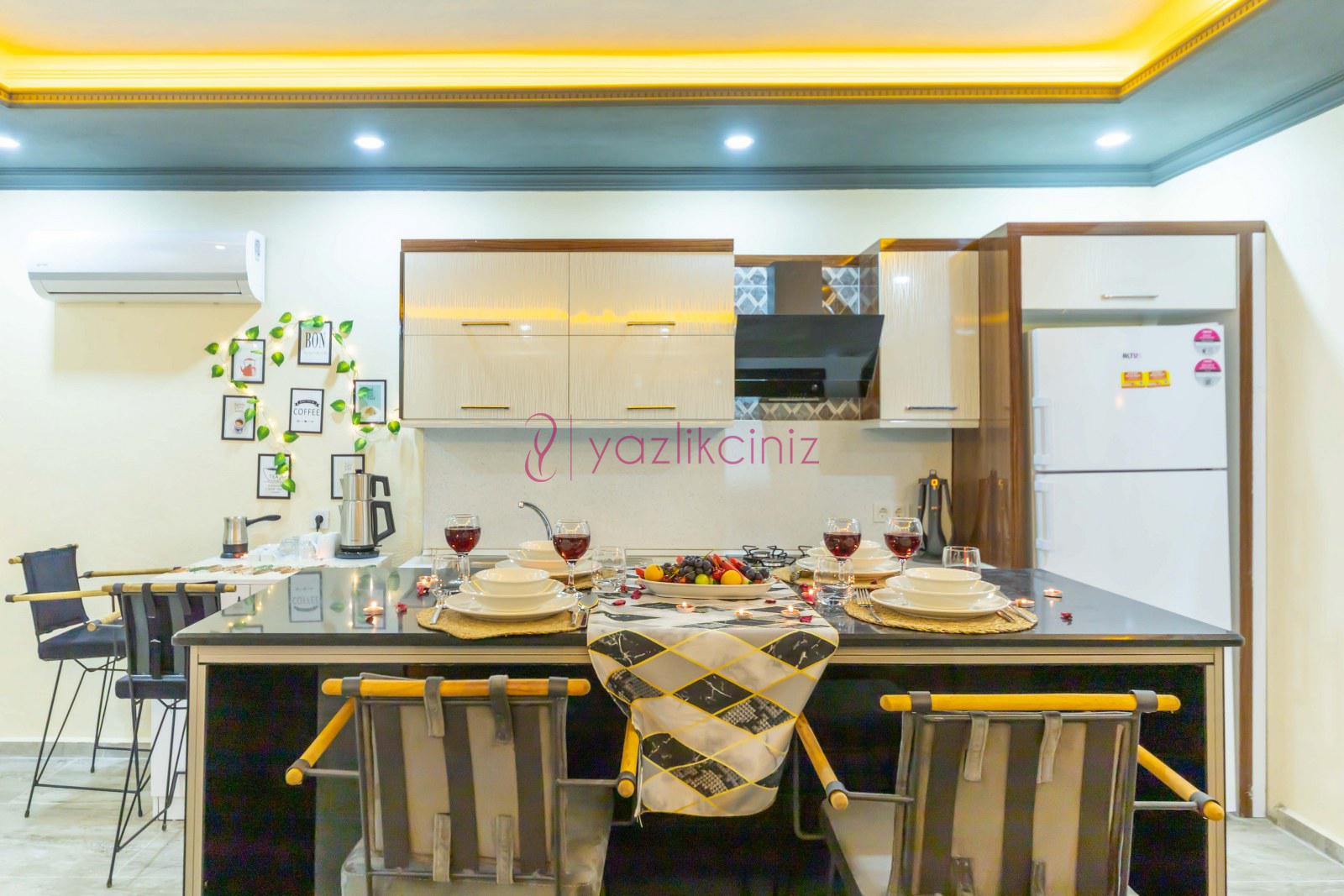 Modern Amerikan mutfakta buz dolabı, bulaşık makinesi, 4'lü ocak, fırın, mikrodalga fırın, ekmek kızartma makinesi, kettle, 4 kişilik yemek masası, yemek takımları, çatal ve bıçak takımları, tencere ve tava takımları, bardaklar bulunmaktadır.