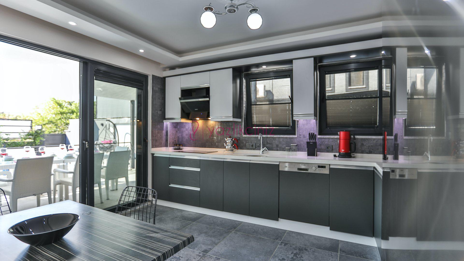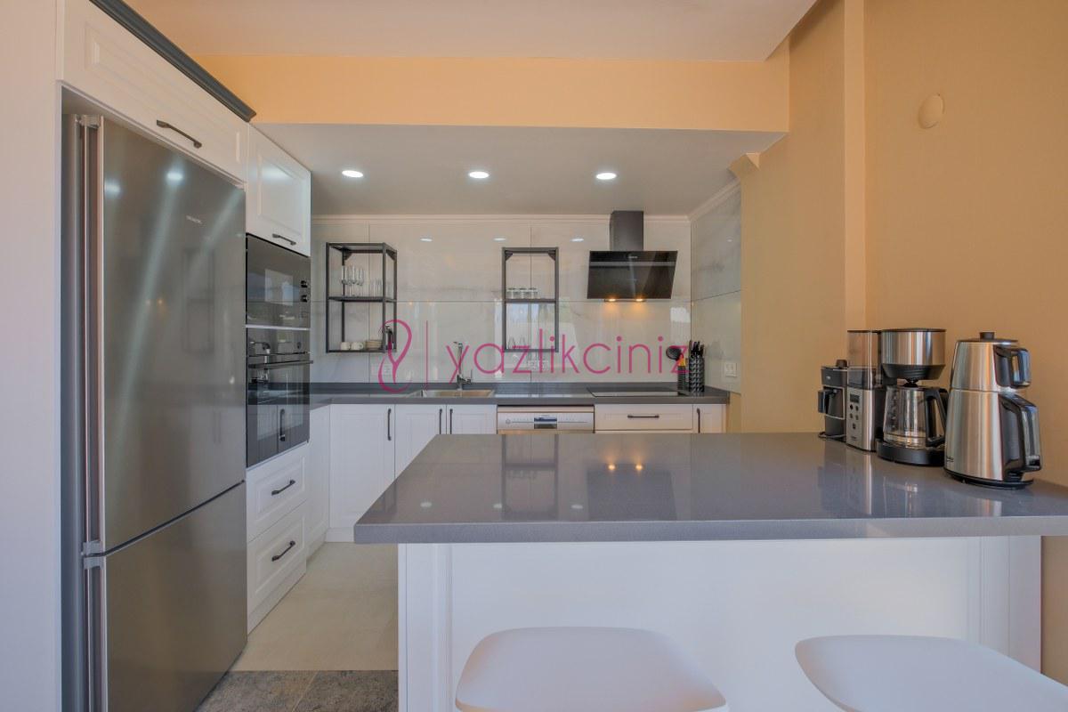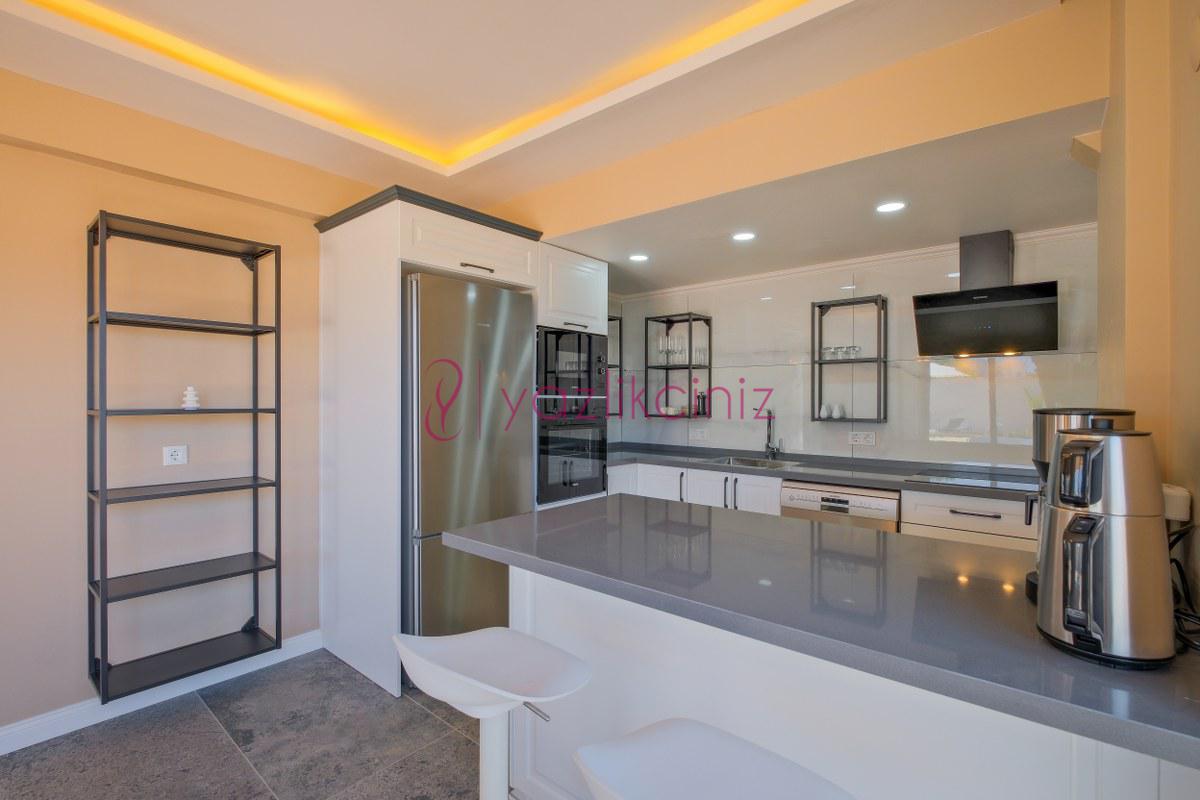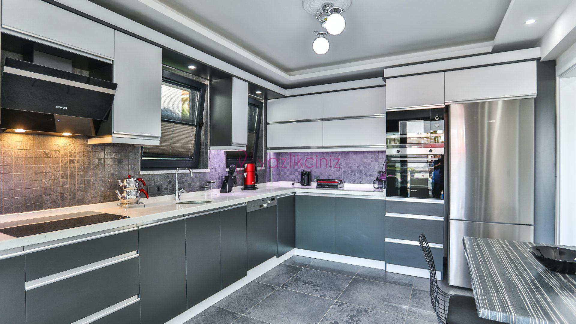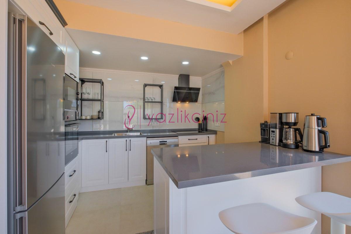 Buzdolabı, fırın, mikrodalga, çamaşır makinesi, bulaşık makinesi, 4’lü ocak, elektrikli su ısıtıcısı (kettle), elektrikli süpürge, 8 kişilik yemek takımı, tava, tencereler, çatal ve bıçak takımı ve diğer mutfak malzemesi mevcuttur.