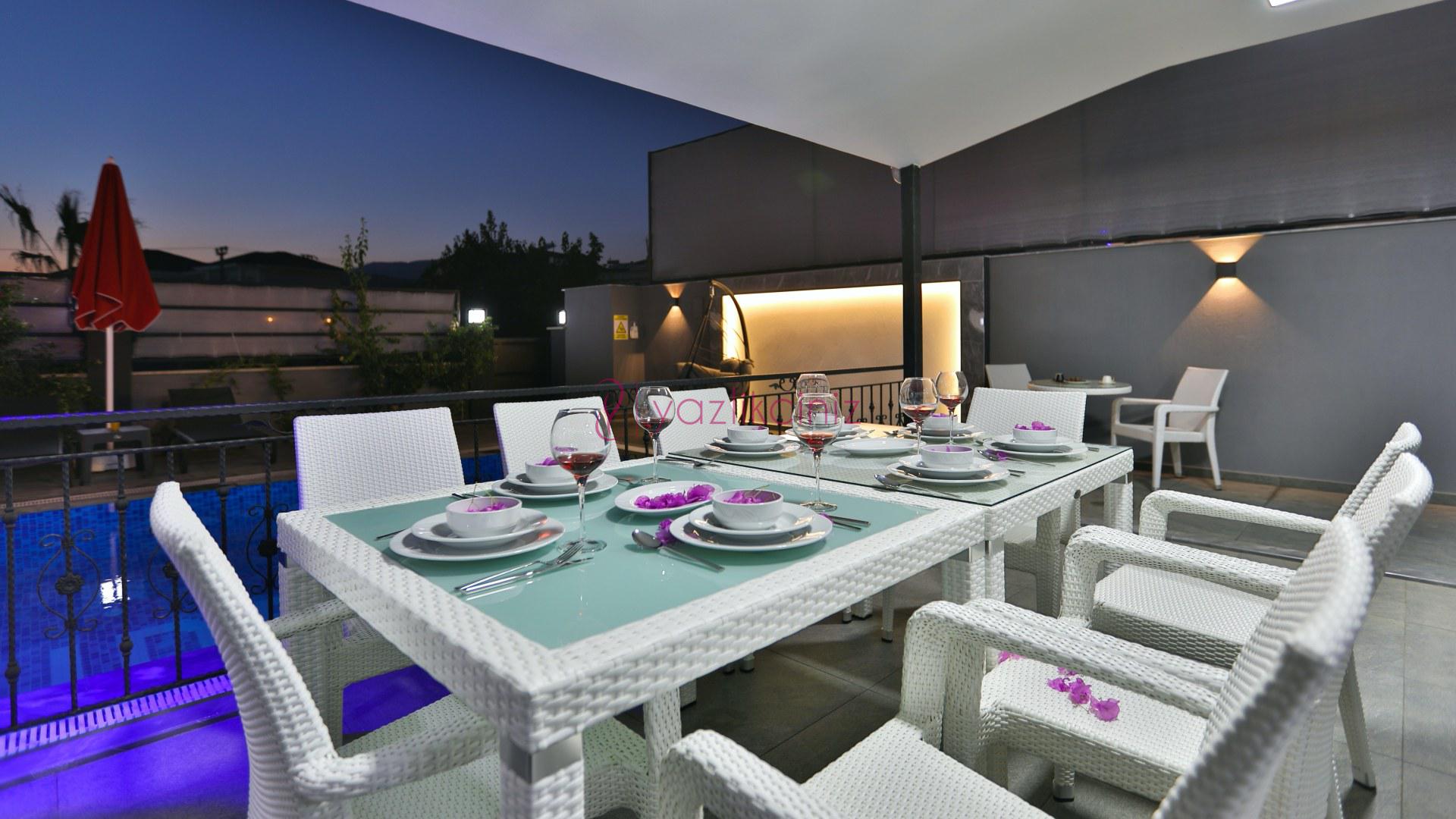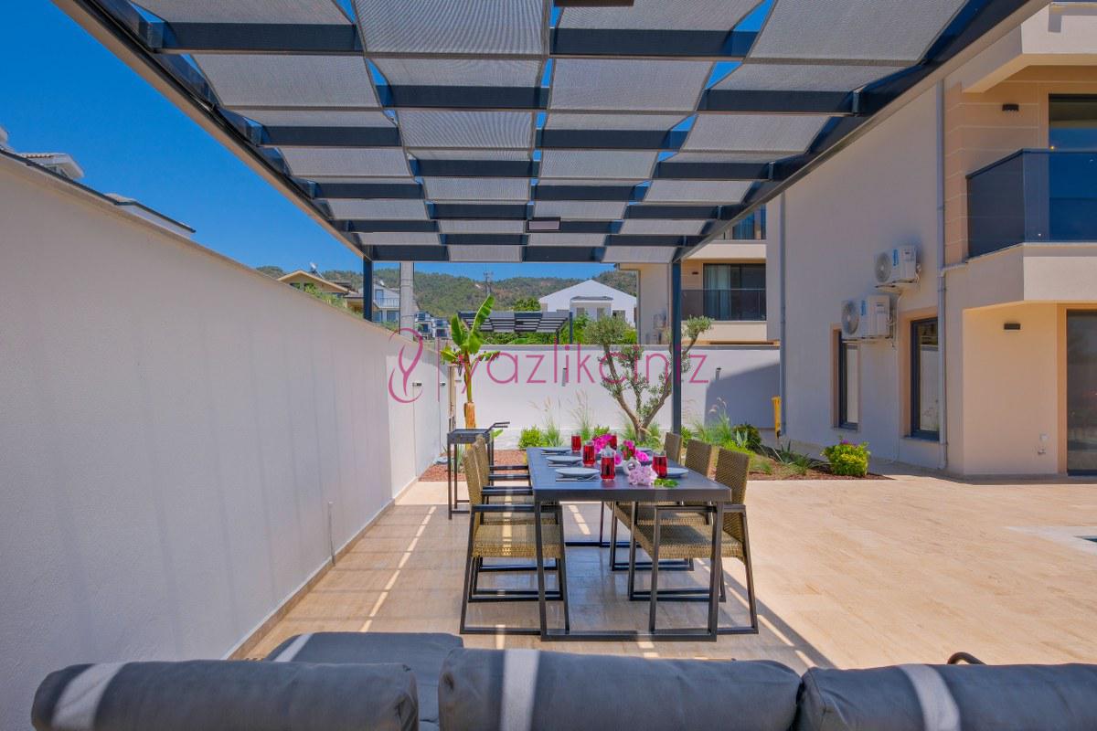 Şezlonglar, güneş şemsiyesi, mangal, yemek masası ve sandalyeler bulunmaktadır.